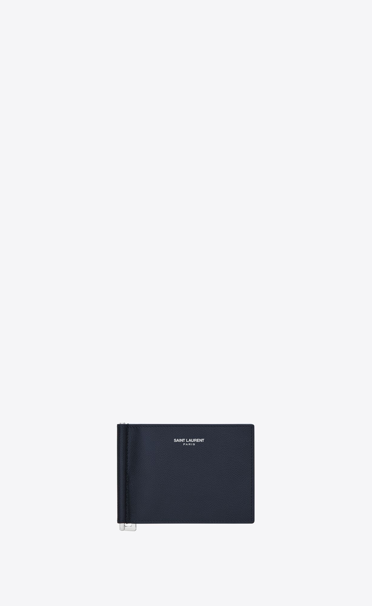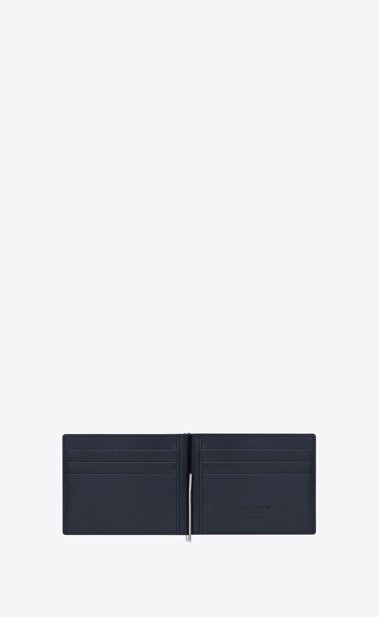 saint laurent single-fold wallet made with metal-free tanned leather with hinged bill clip and embossed saint laurent signature.