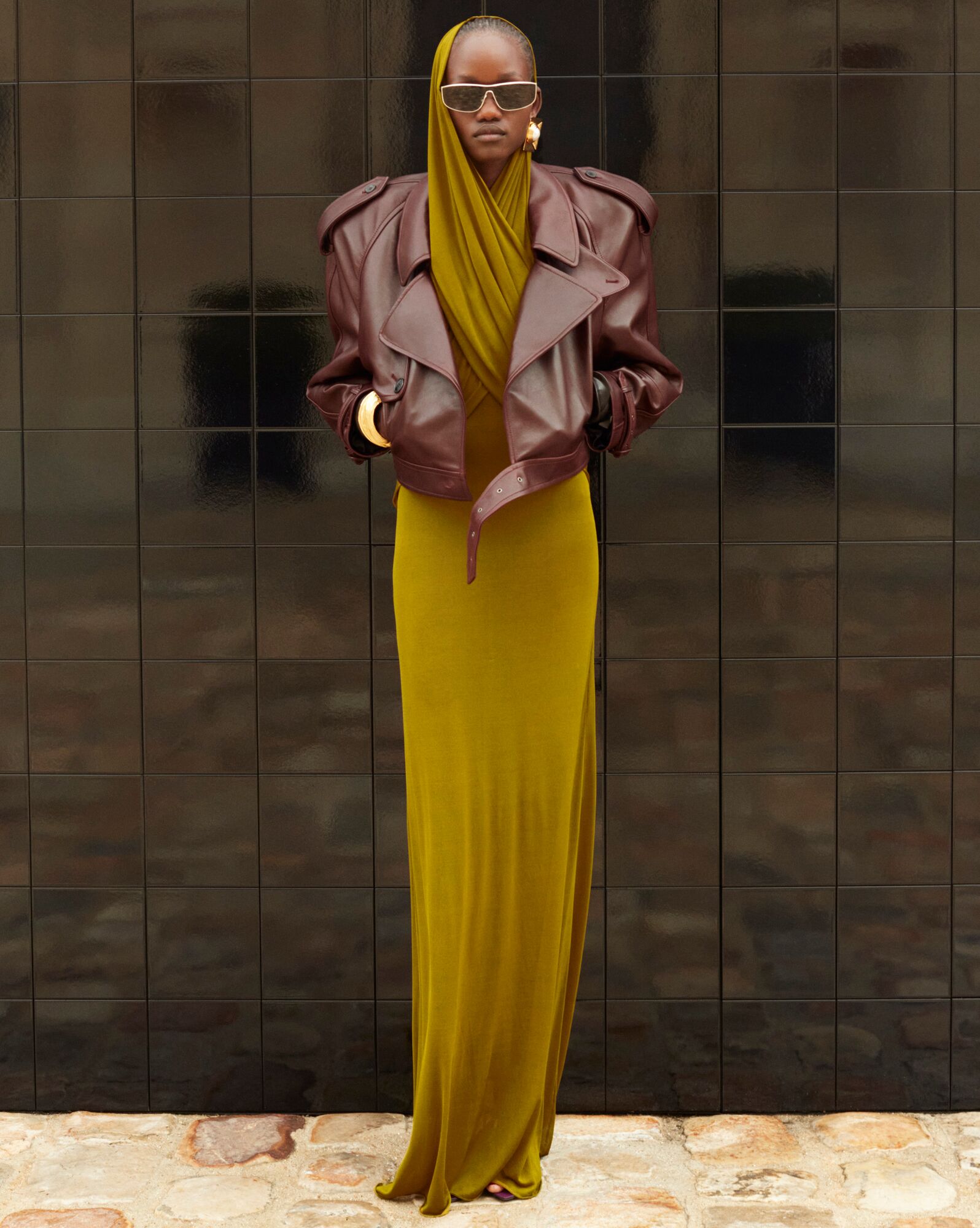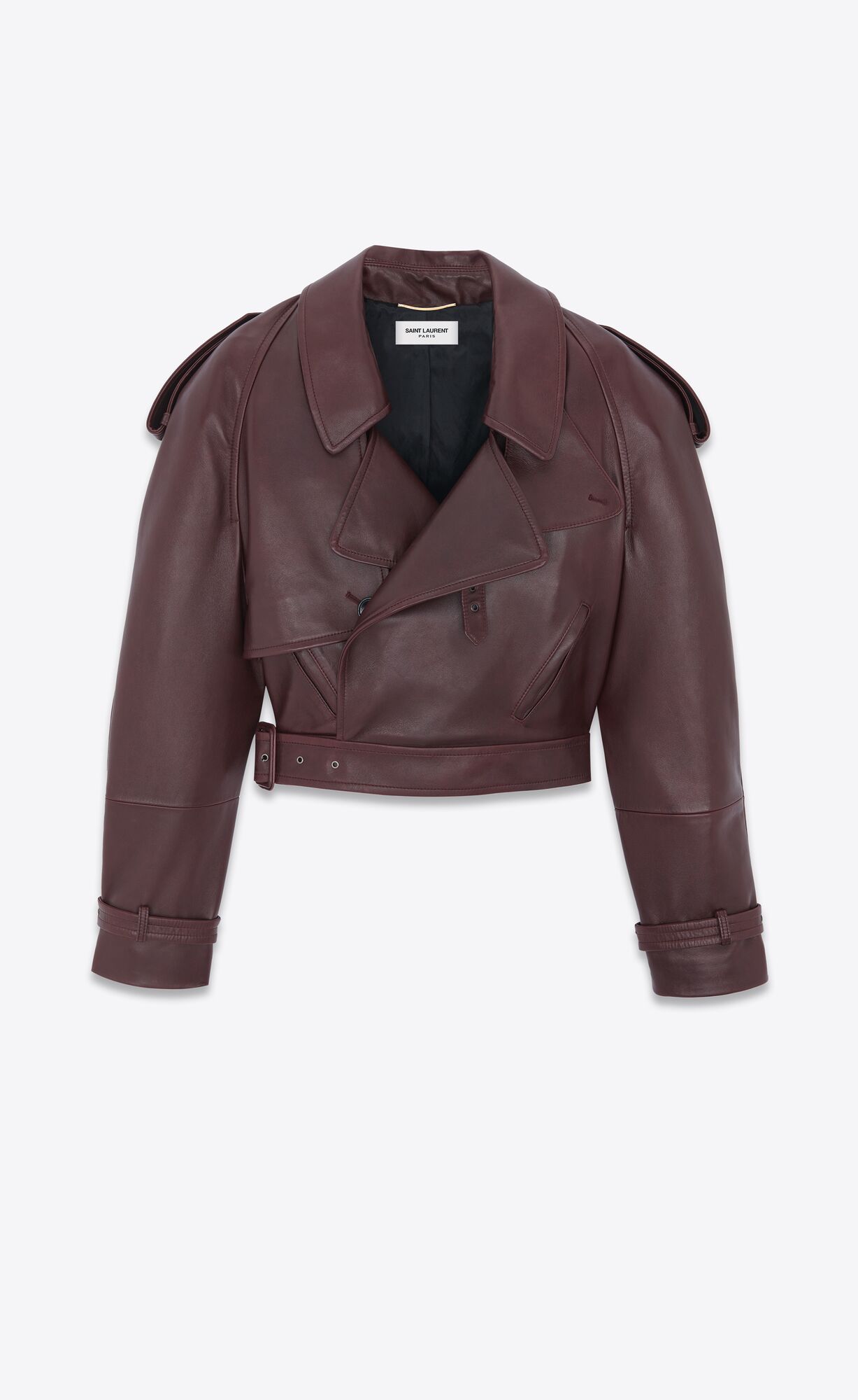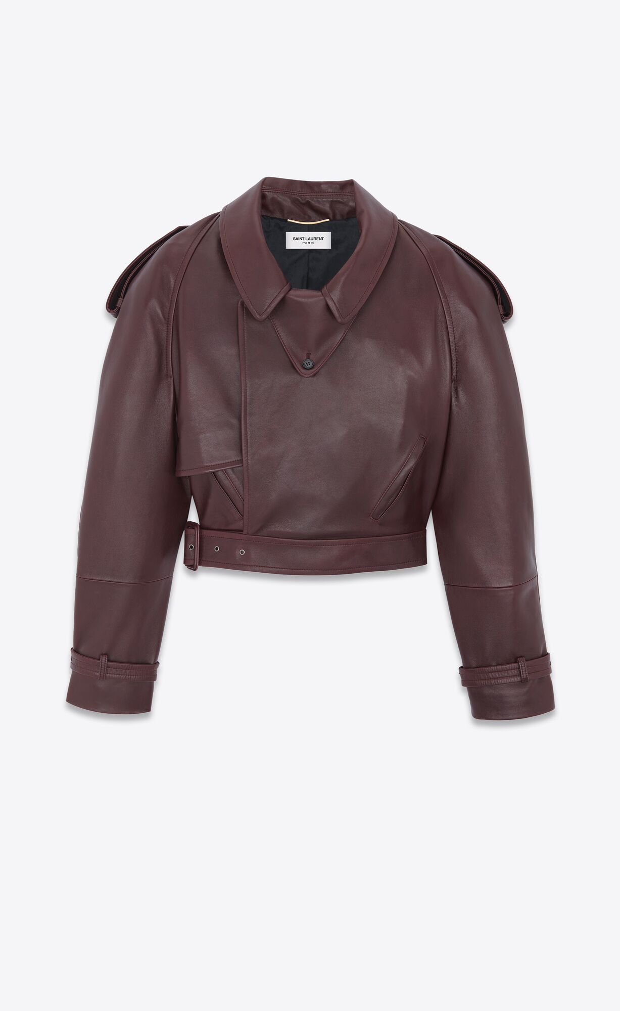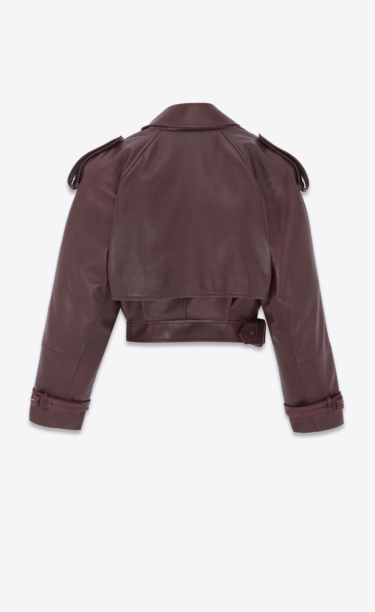 Short leather jacket with notched lapel, storm flap, side pockets and adjustable belt at the waist.