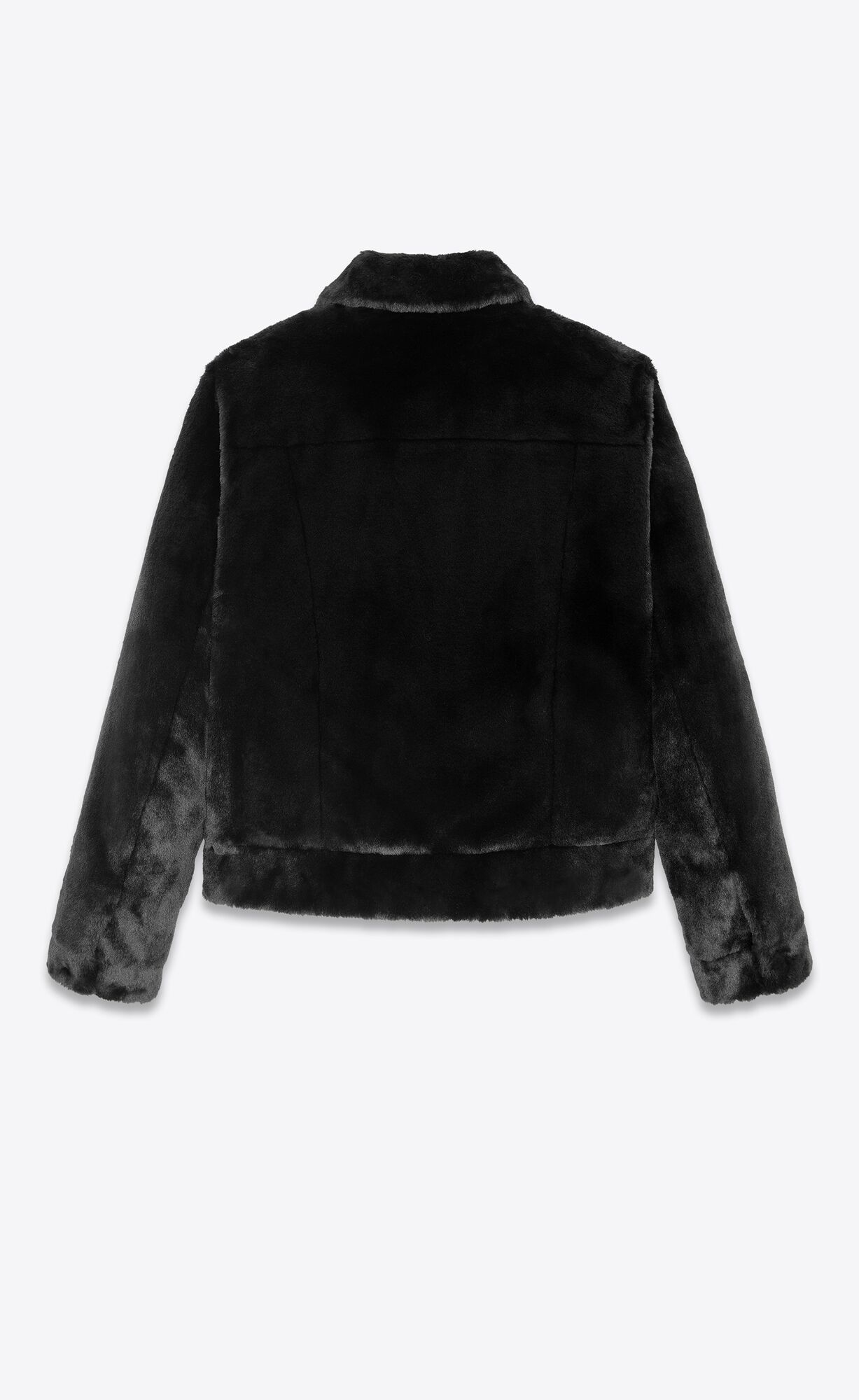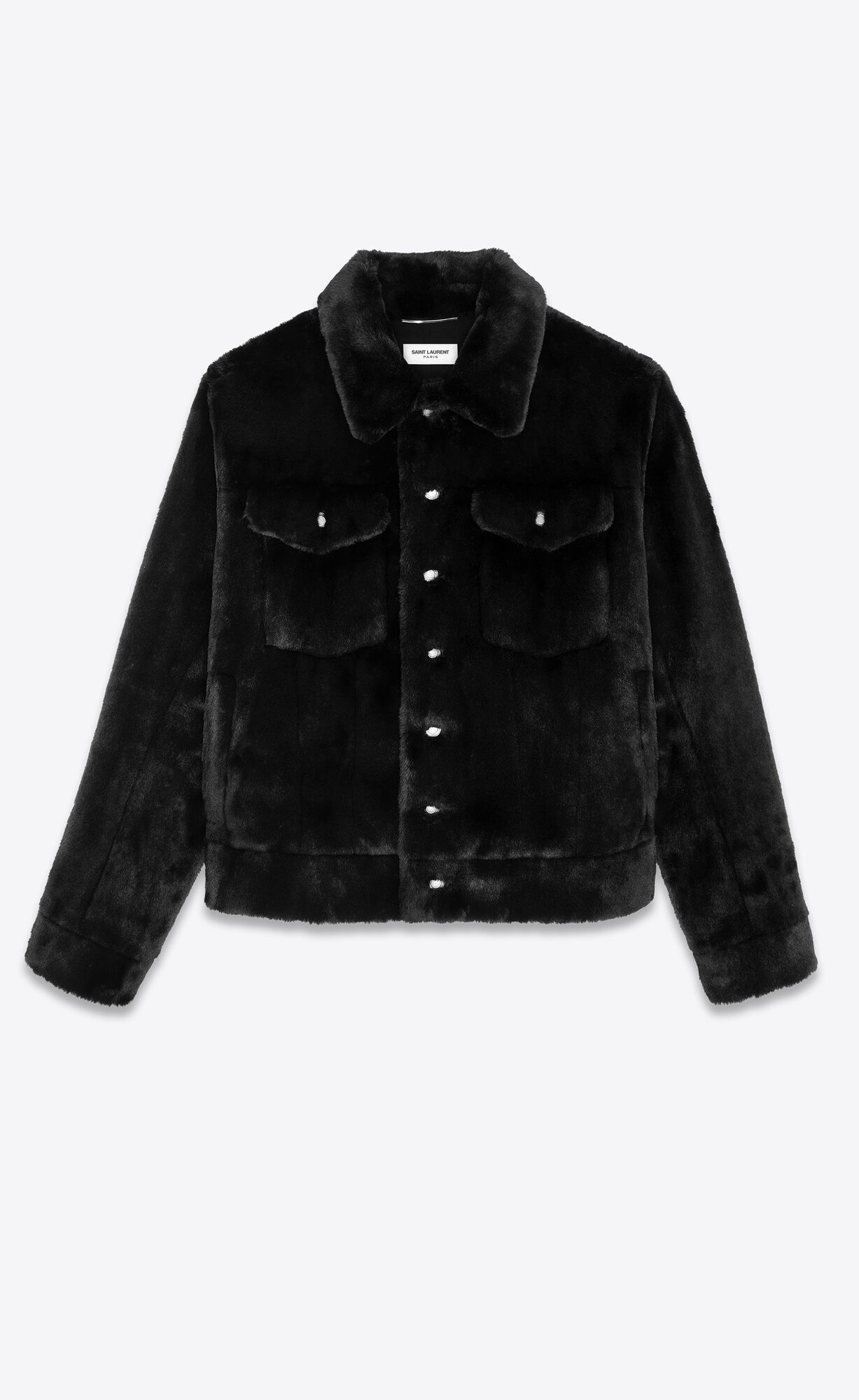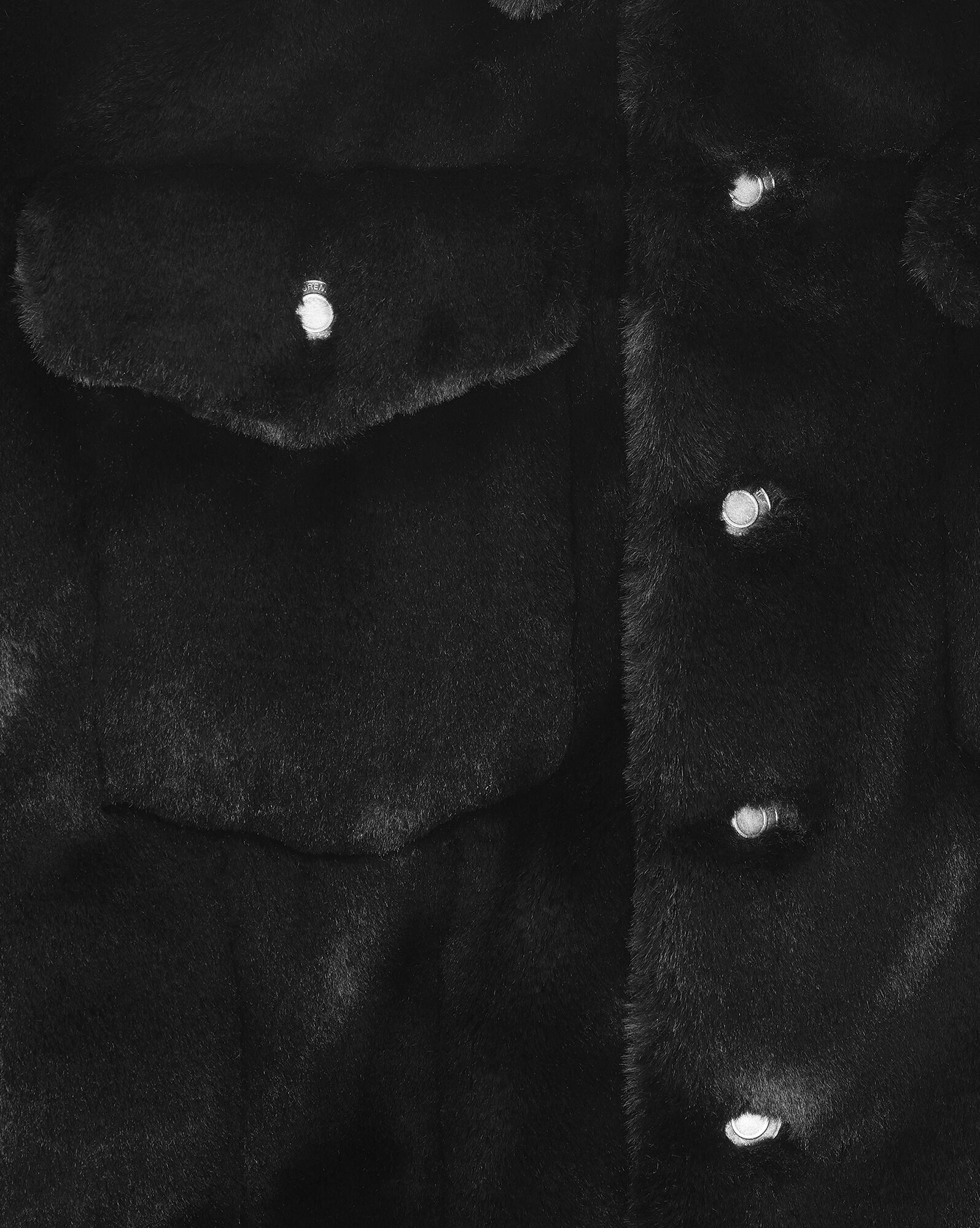 Short jacket with a pointed collar, front button closure and buttoned patch pockets on the chest.