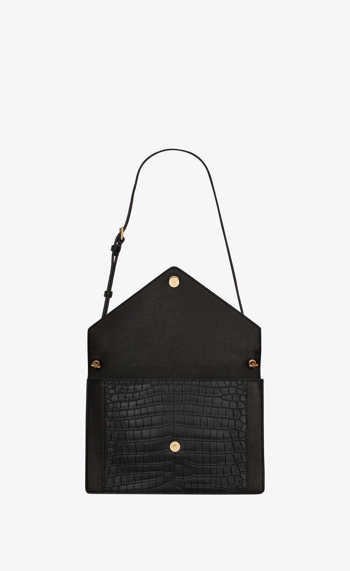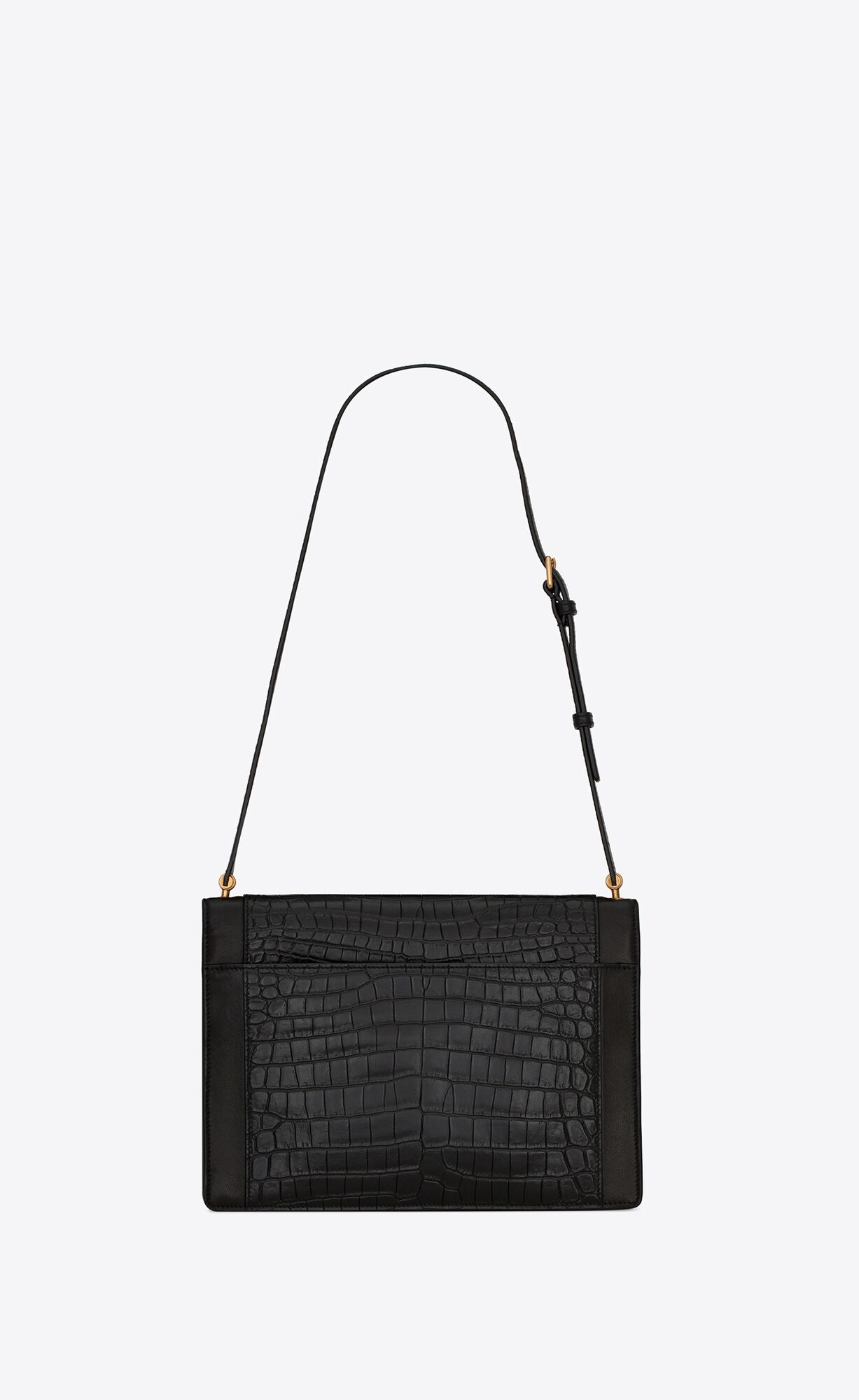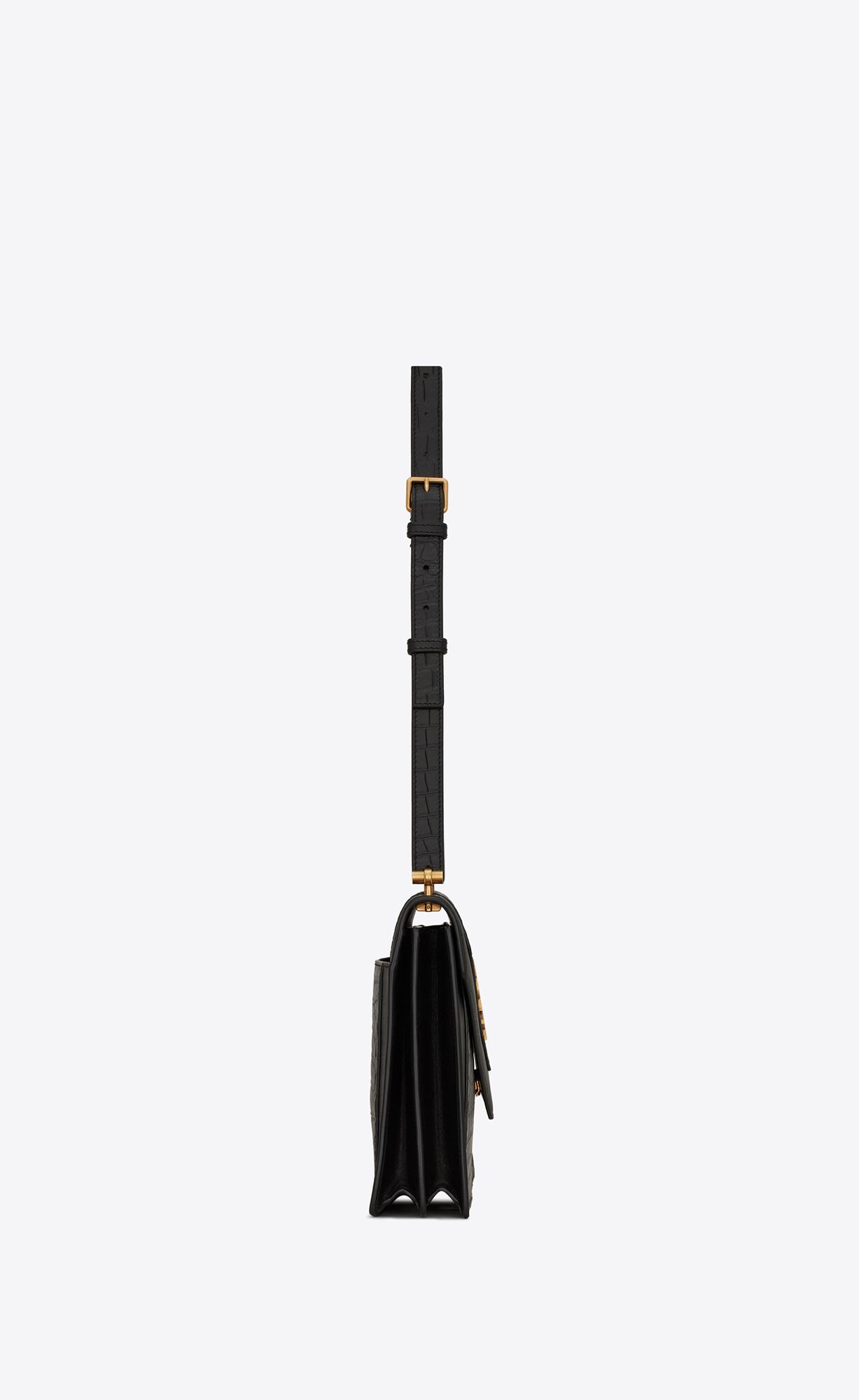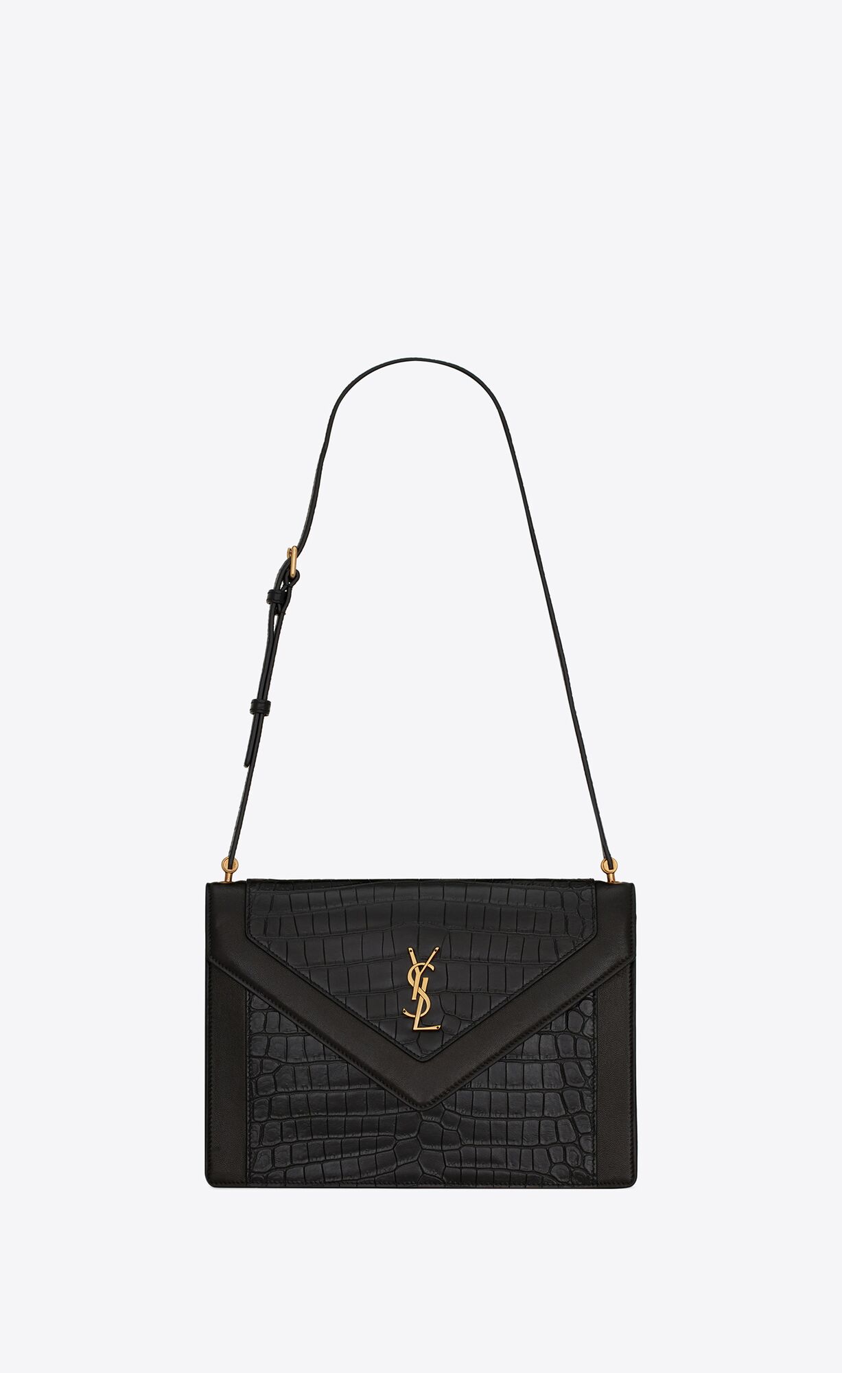 Gaby satchel with a front flap, magnetic snap closure and THE CASSANDRE, featuring a leather shoulder strap.