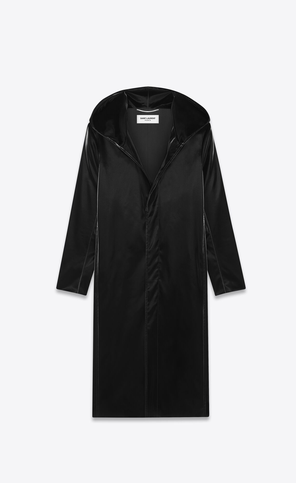 Long hooded coat with concealed button closure and slit pockets at the sides.
