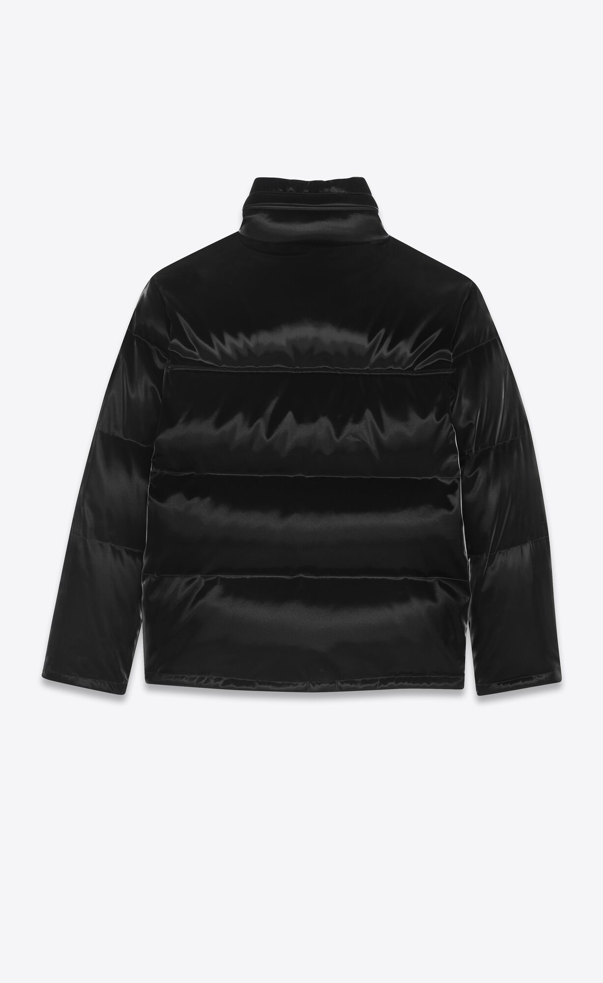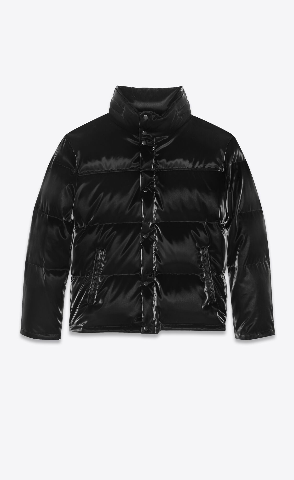 Oversize down jacket with high collar with concealed hood, concealed zip and button closure and two zip pockets.