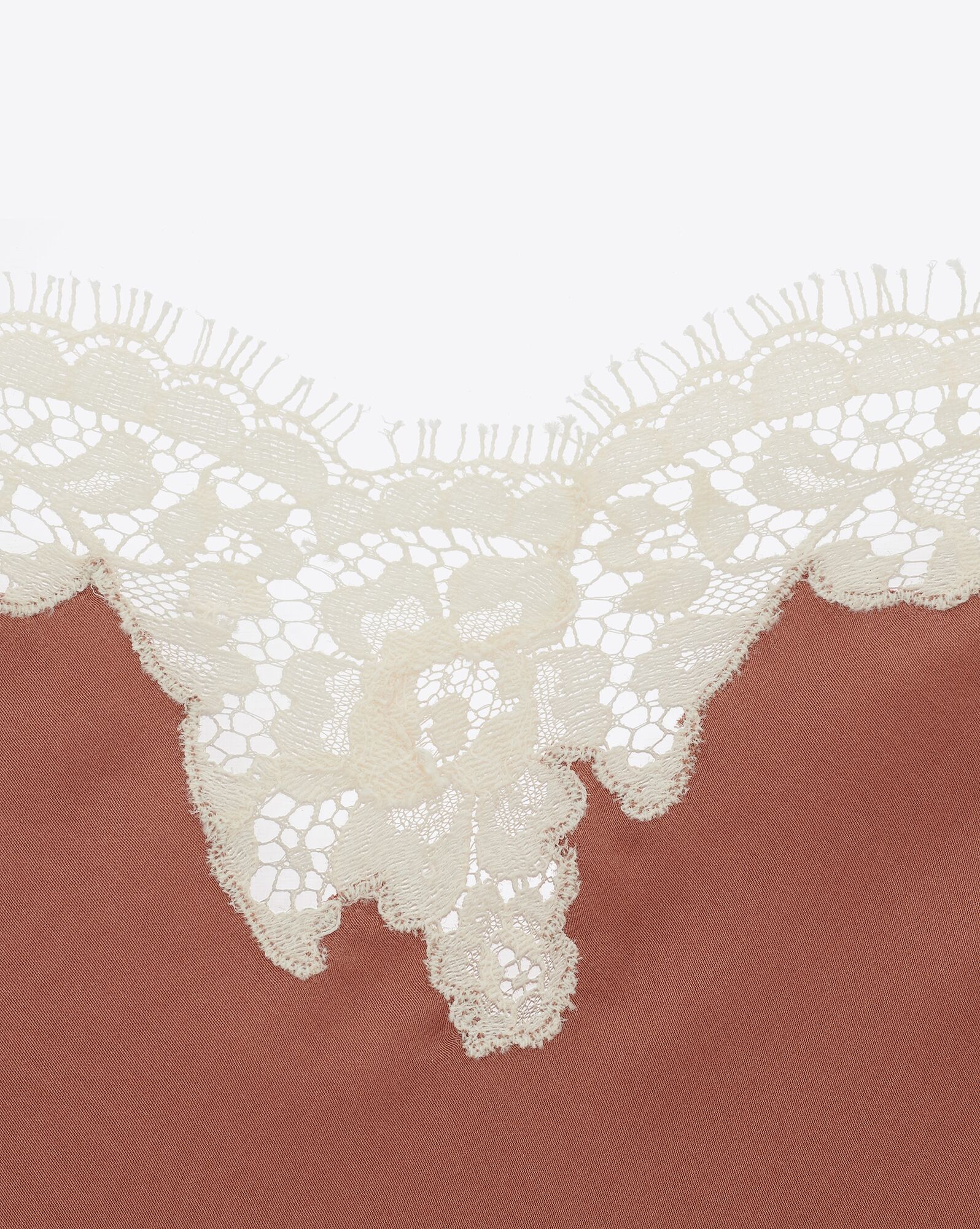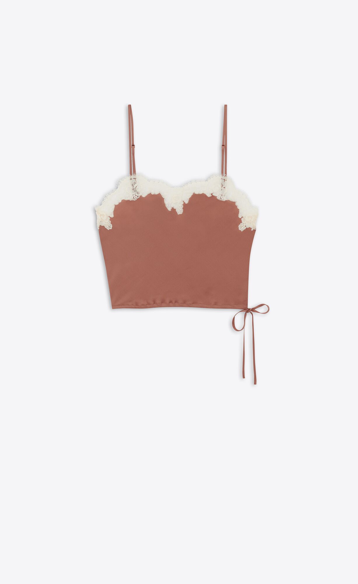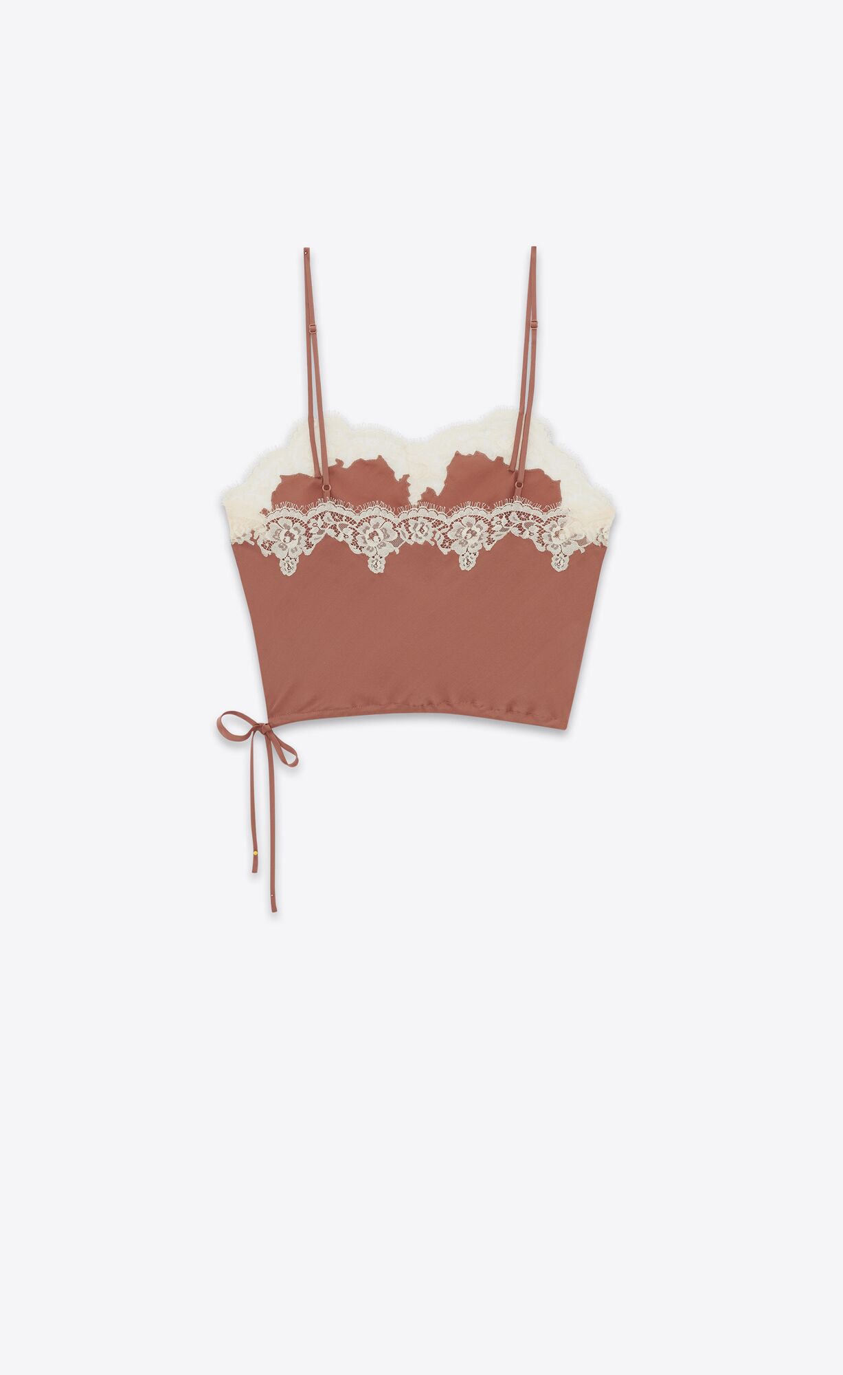 CROPPED TOP MADE WITH ORGANIC SILK, FEATURING LACE NECKLINE, ADJUSTABLE STRAPS AND DRAWSTRING AT THE HEM.