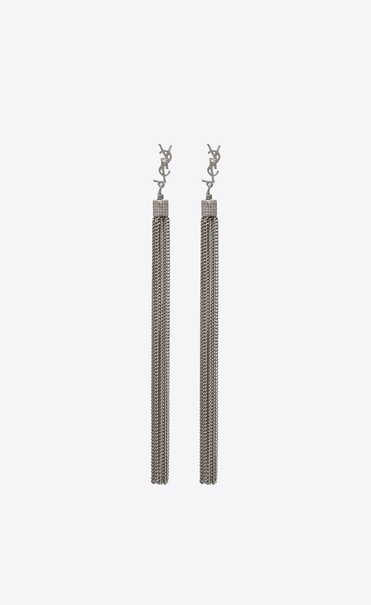 post earrings with hammered CASSANDRE and brass metal chain tassels.