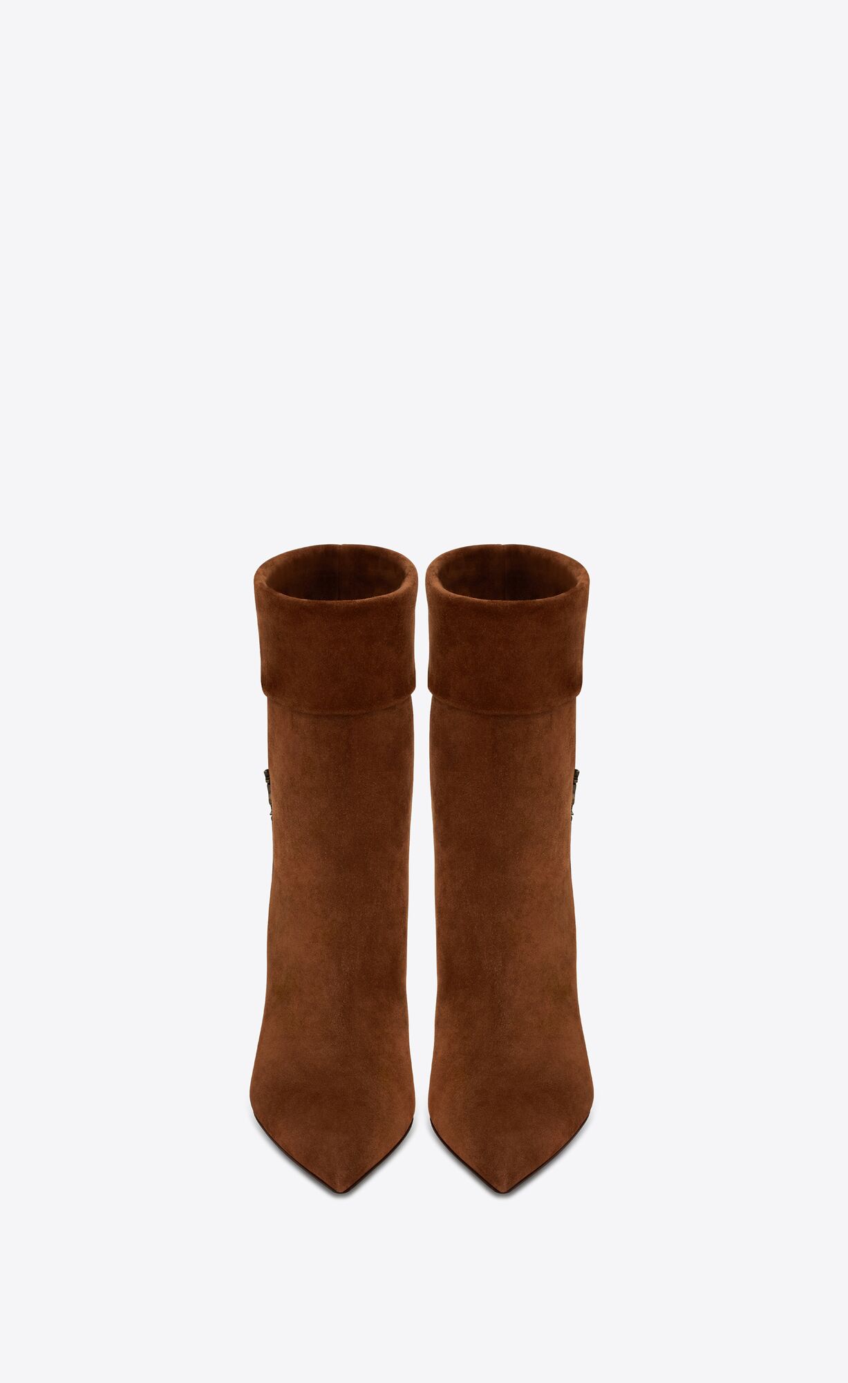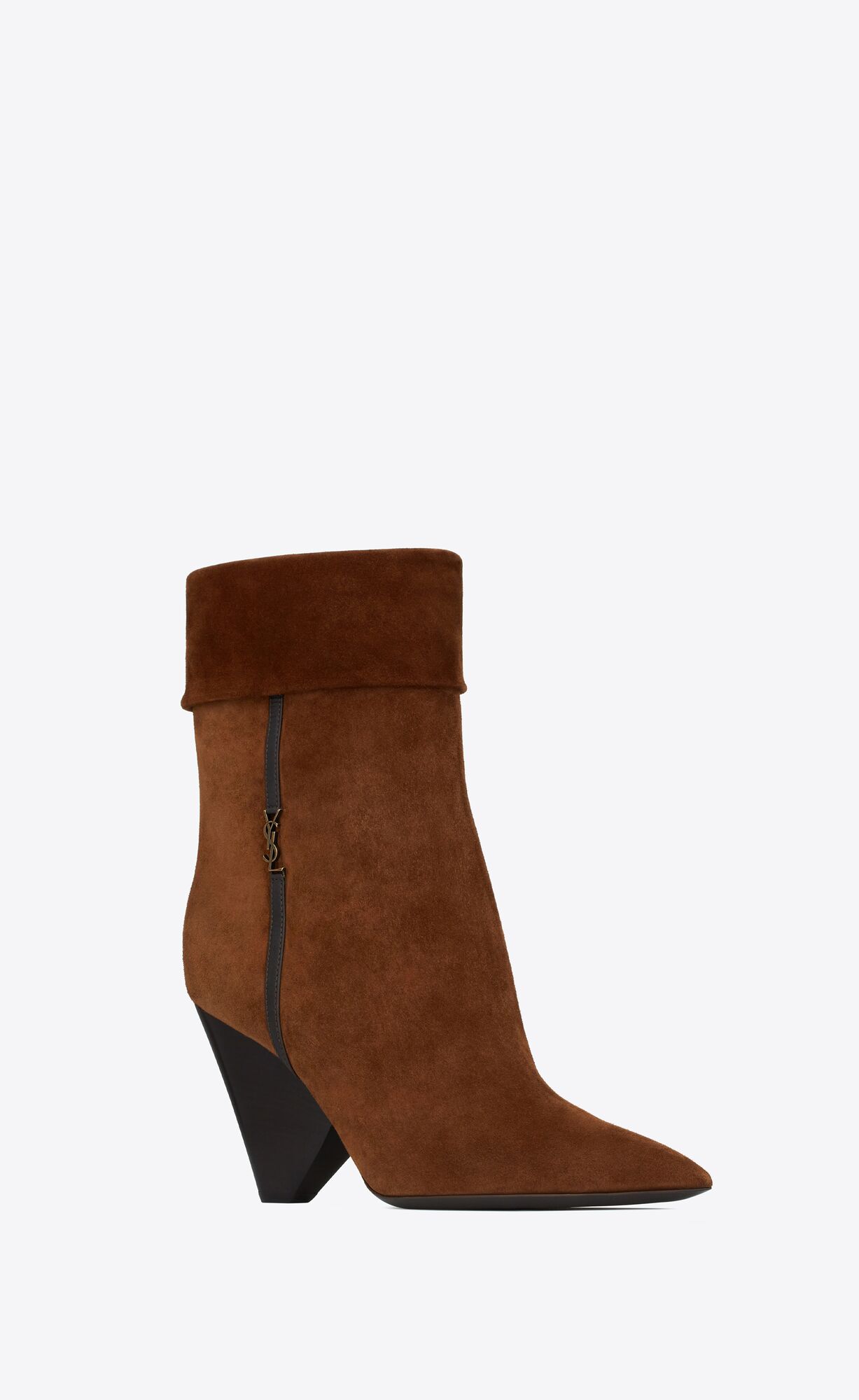 Ankle boots with a pointed toe and a stacked cone heel, decorated with the metal CASSANDRE on the side, leather details and a folded shaft.