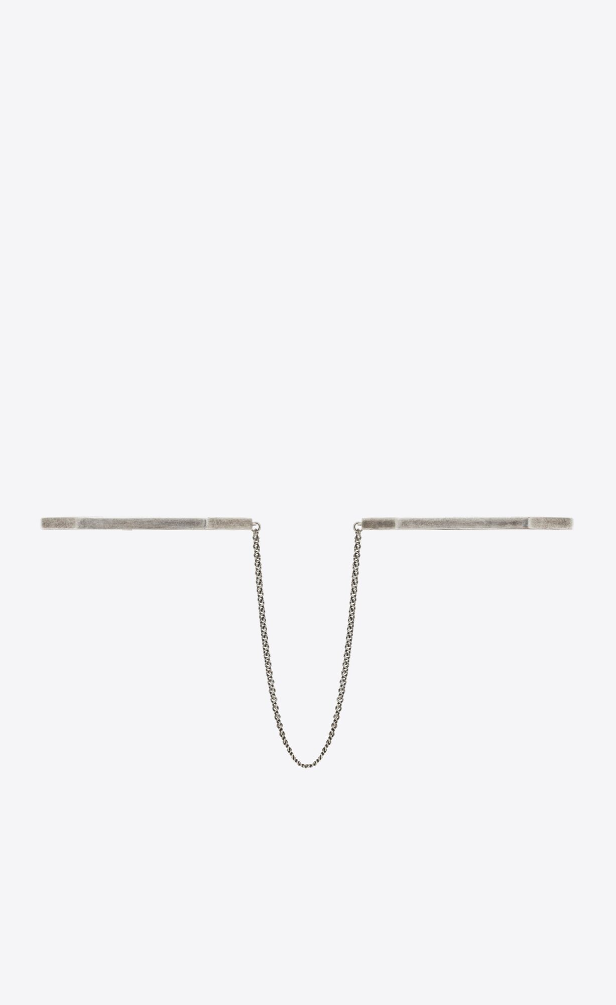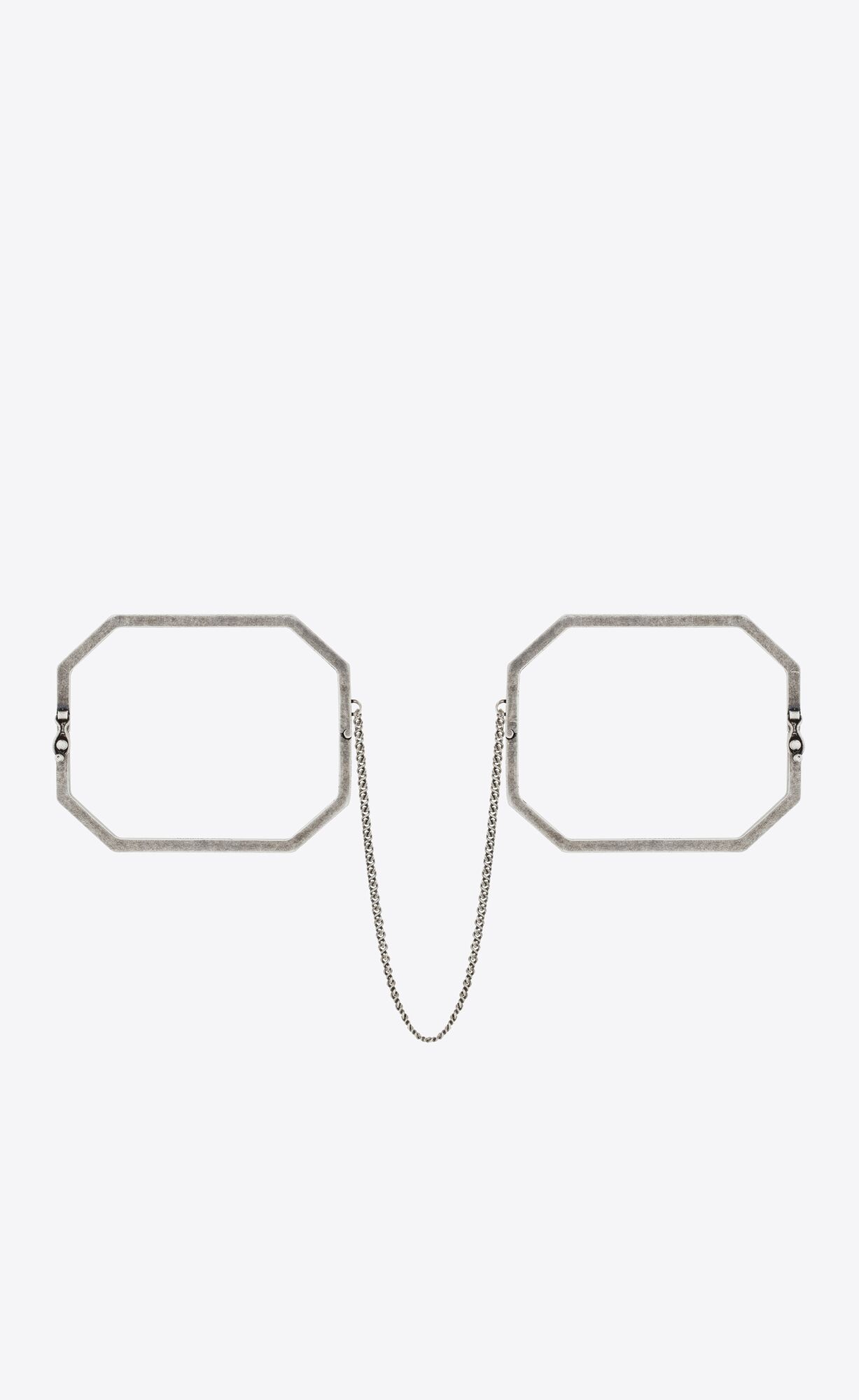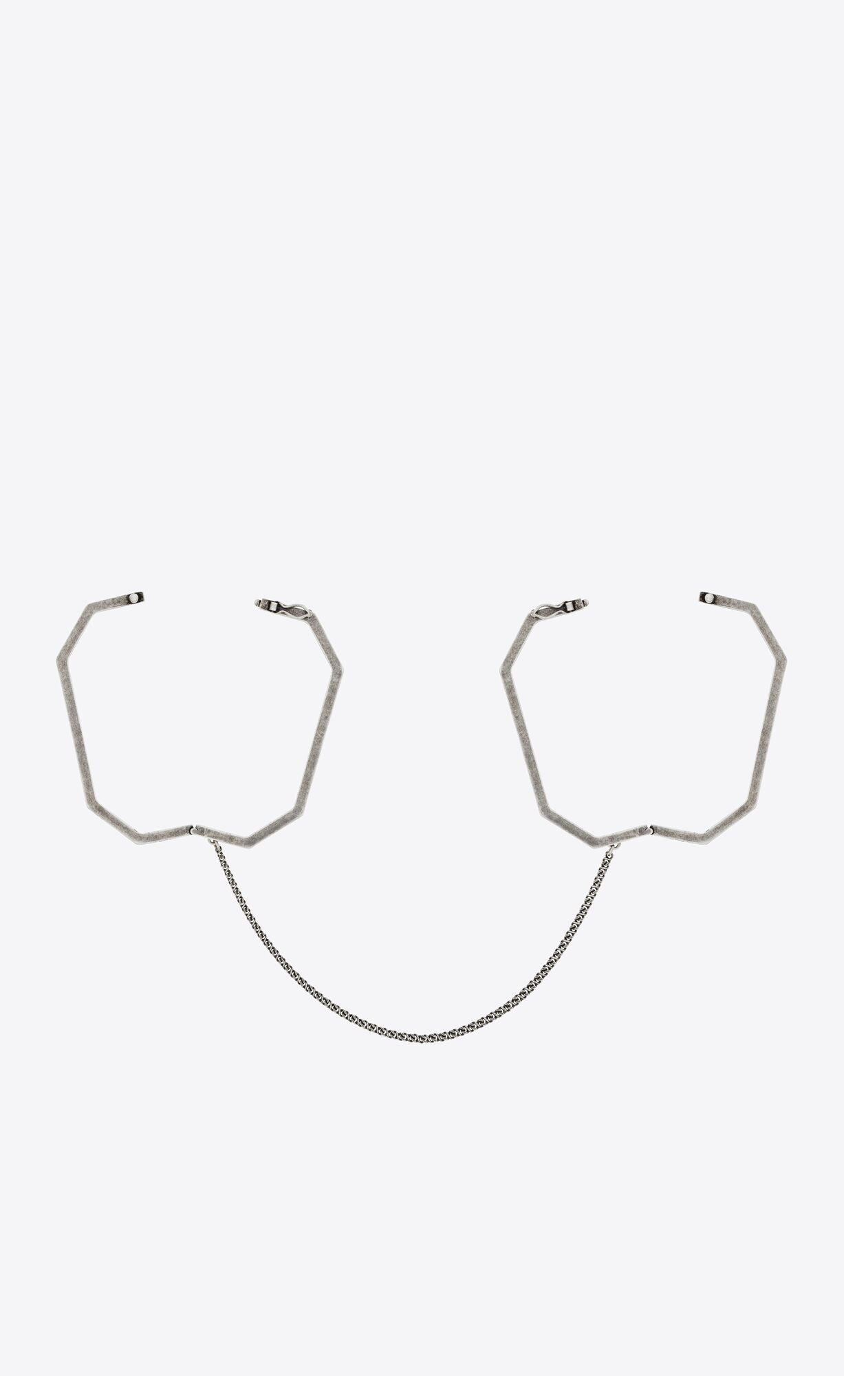 Set of two hinged octagonal bangle bracelets connected by a chain.