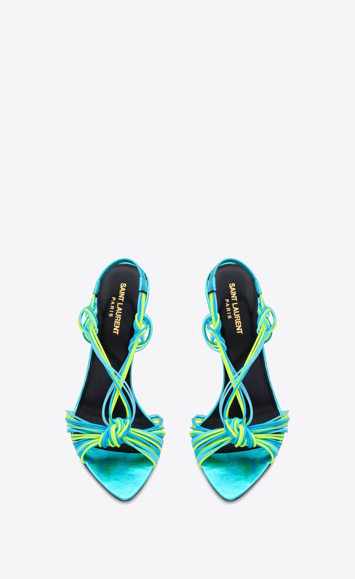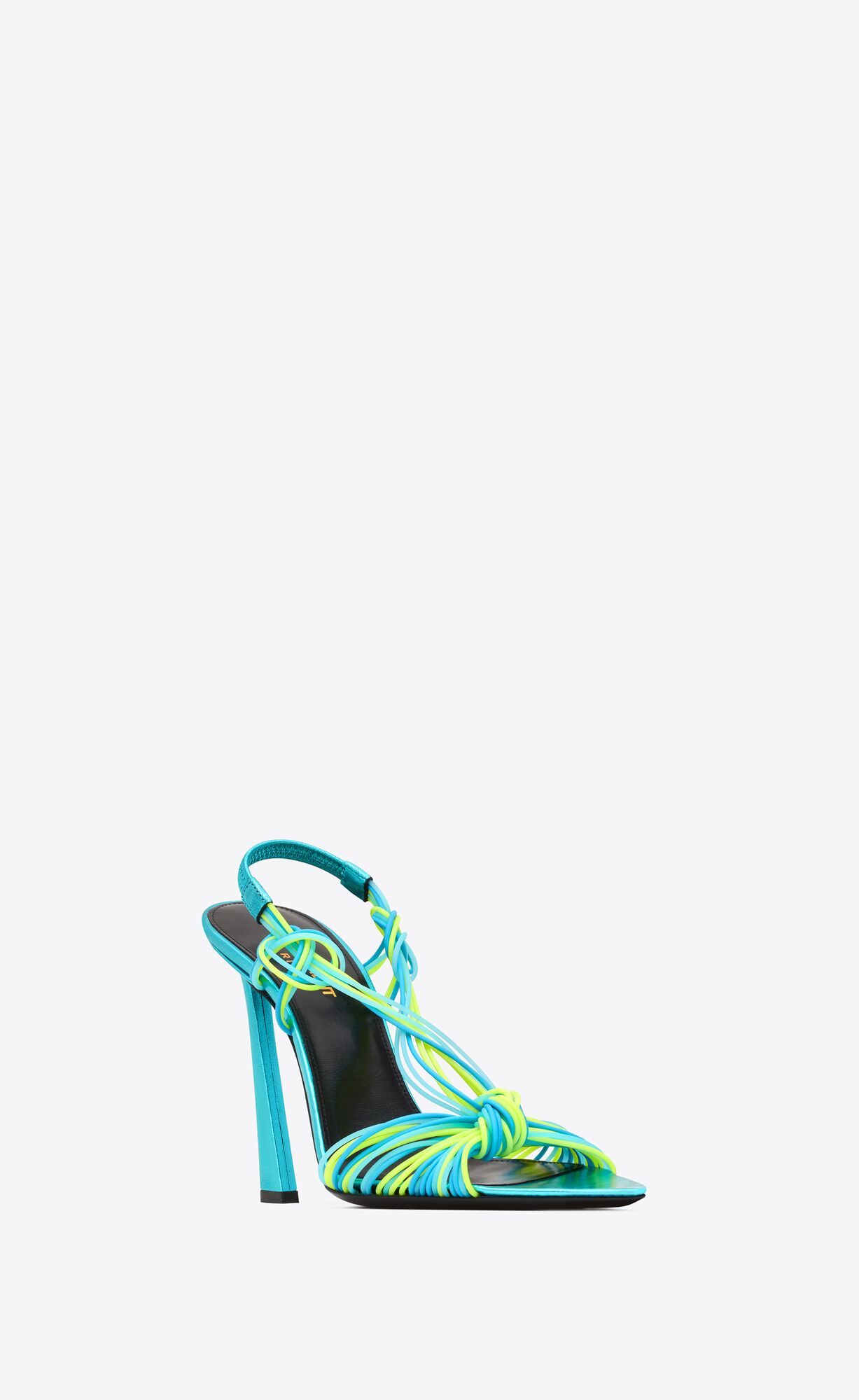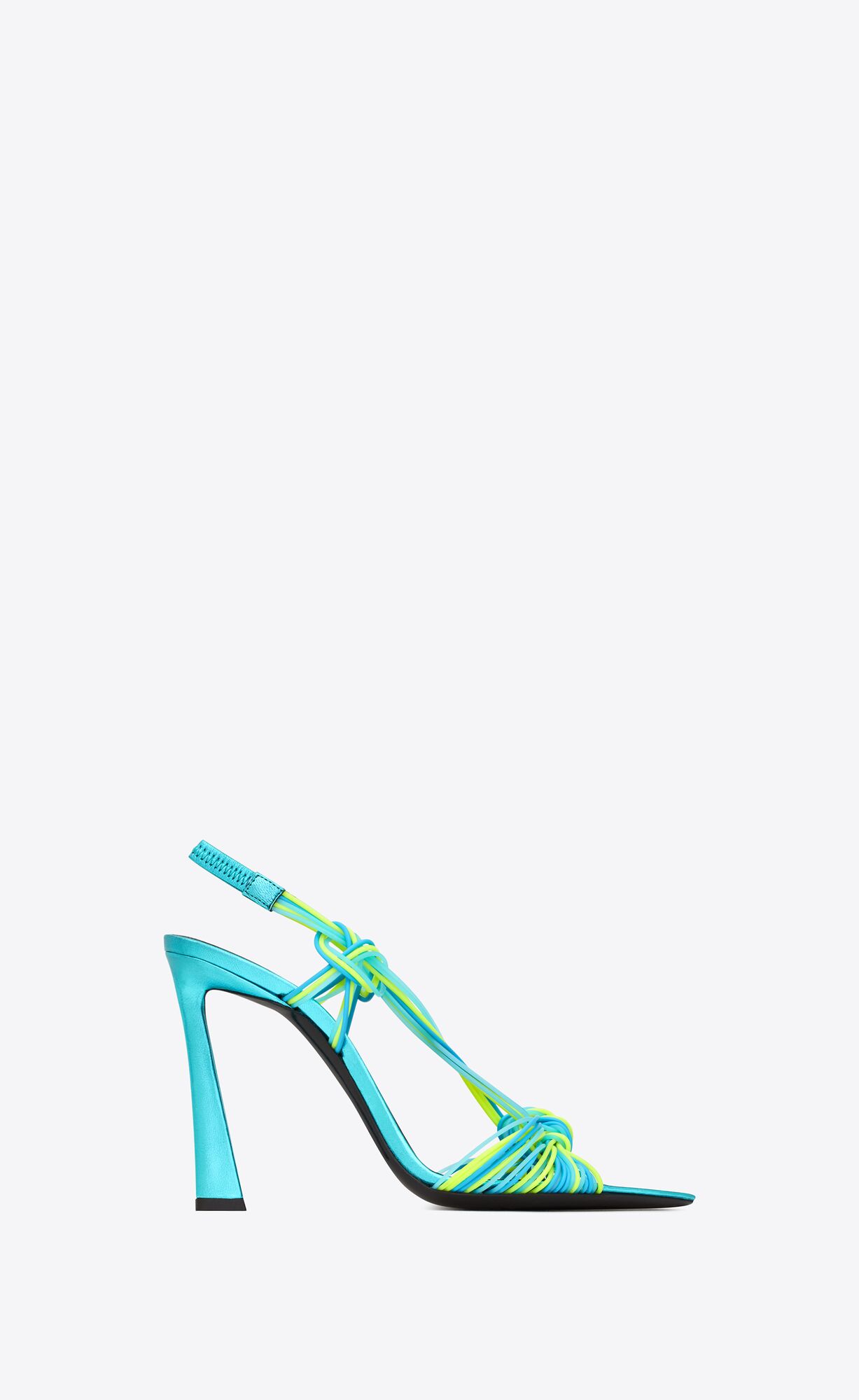 SANDALS WITH CRISSCROSSED KNOTTED STRAPS, ELASTICIZED SLINGBACK STRAP, POINTED TOE AND FLARED COVERED HEEL.