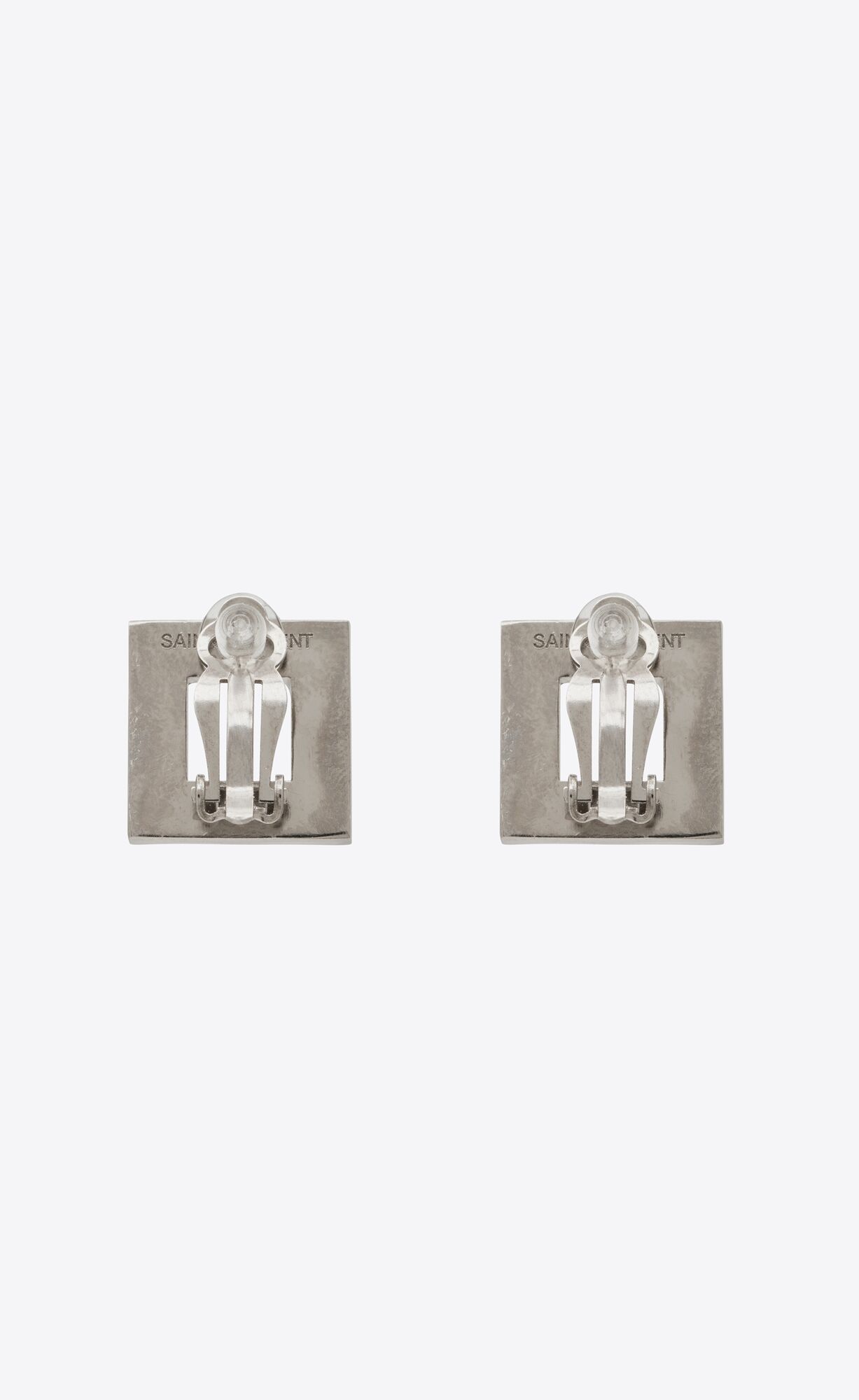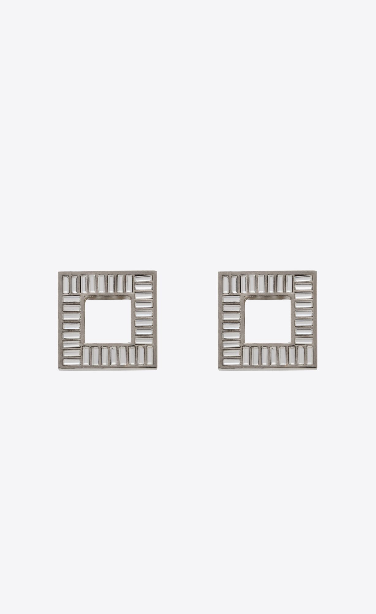 Pair of earrings featuring an open square set with baguette rhinestones.