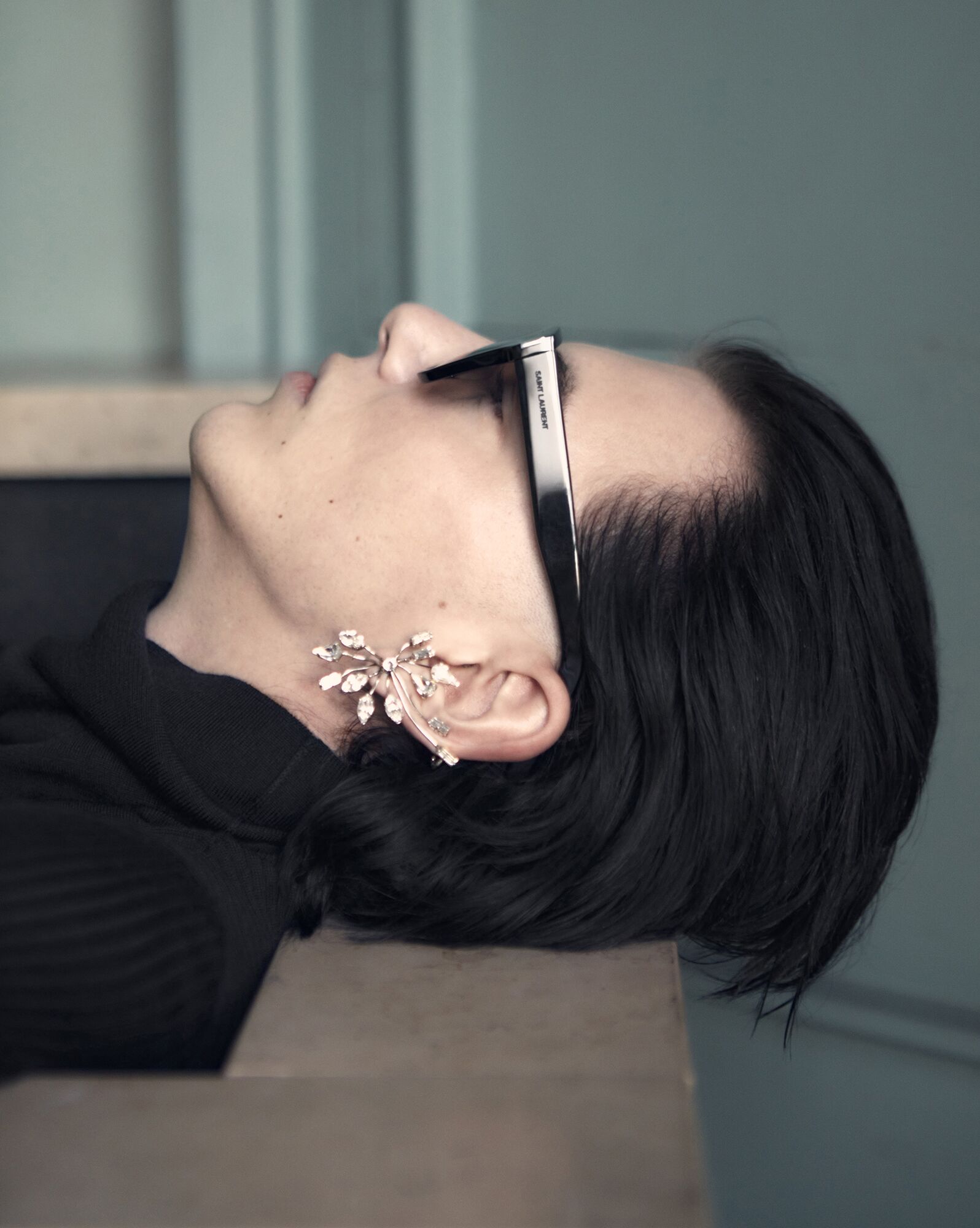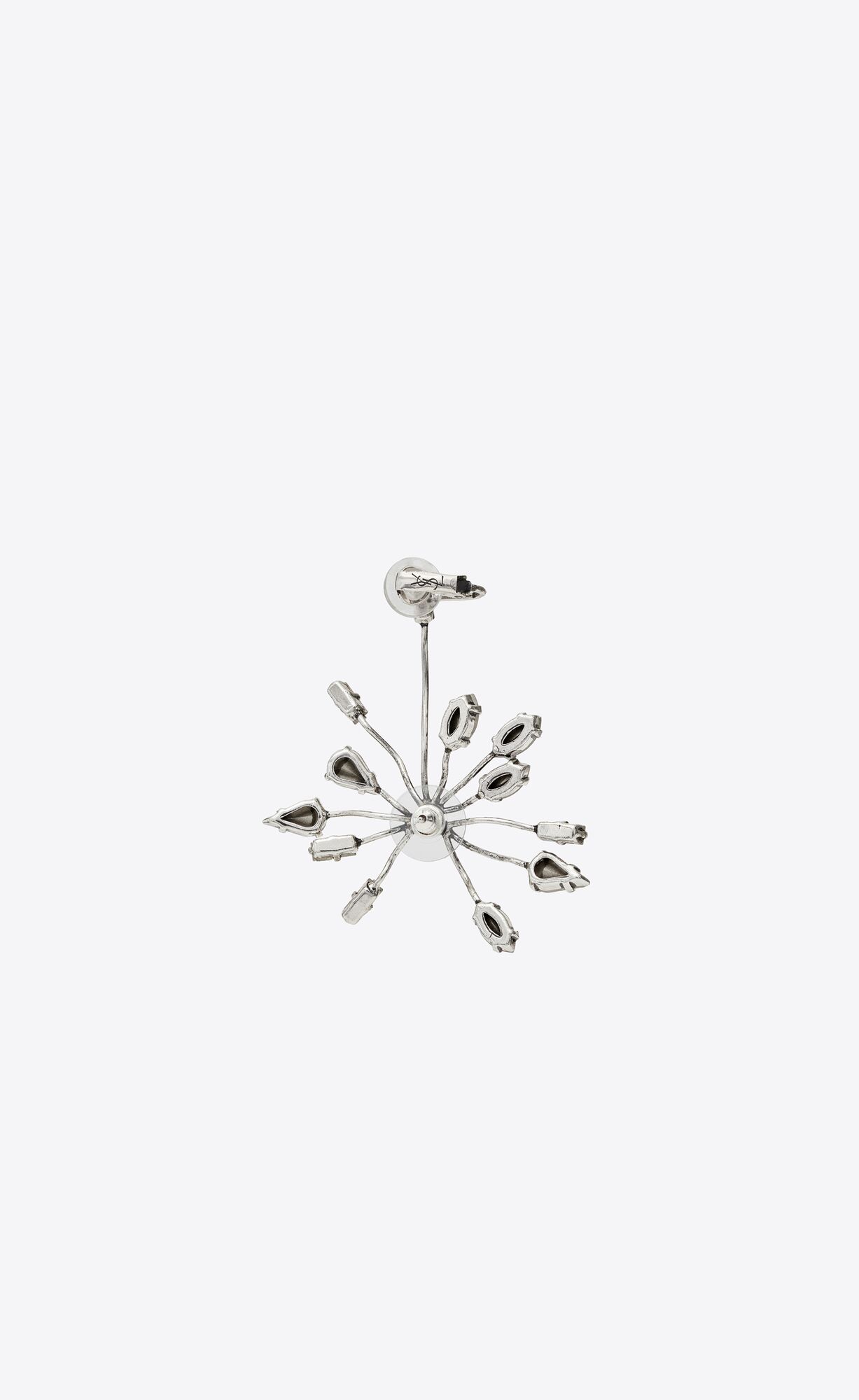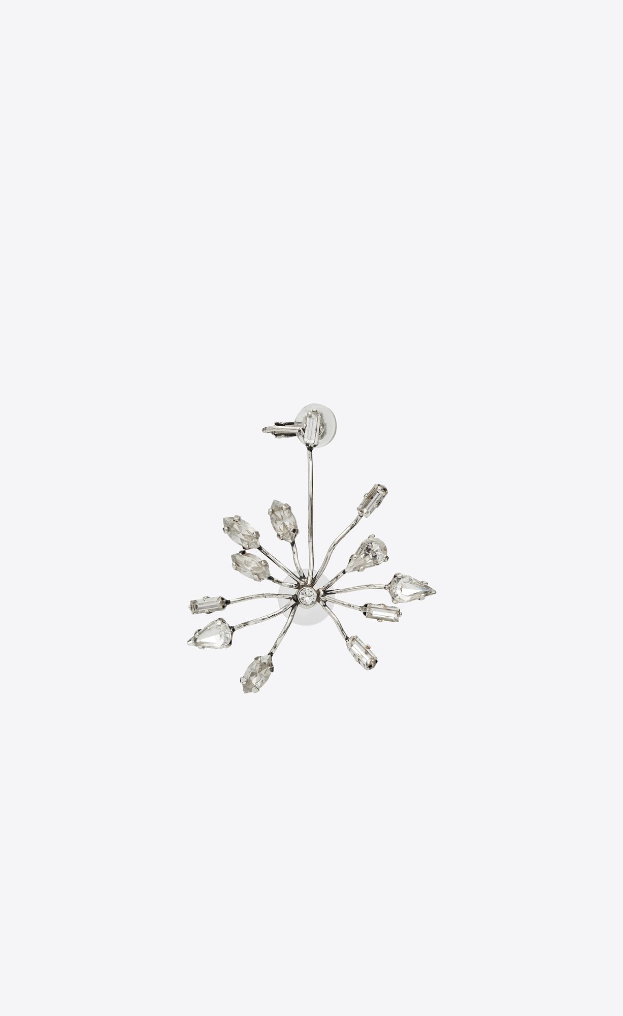Single earring featuring asymmetrical wire blossom adorned with differently shaped rhinestones.