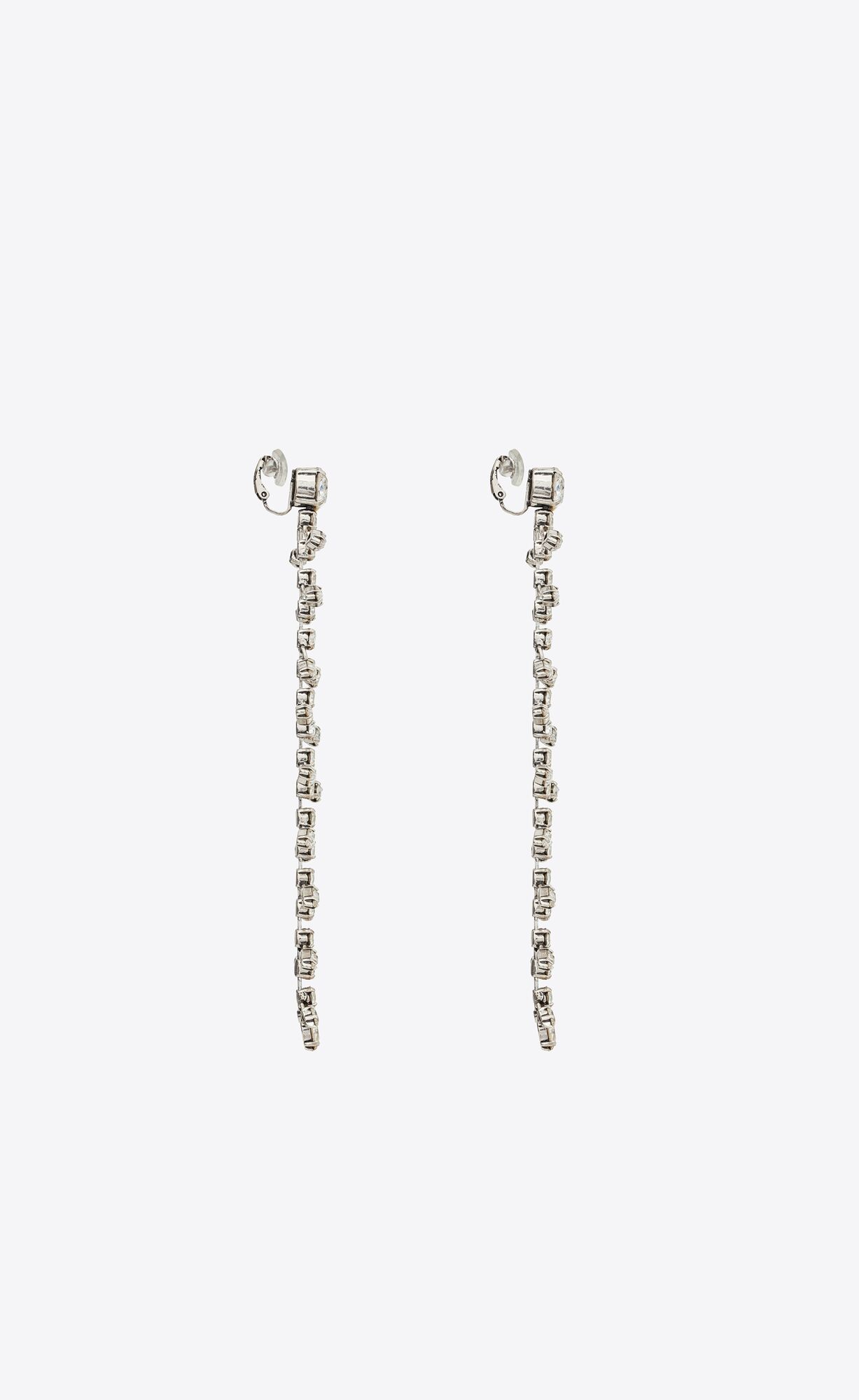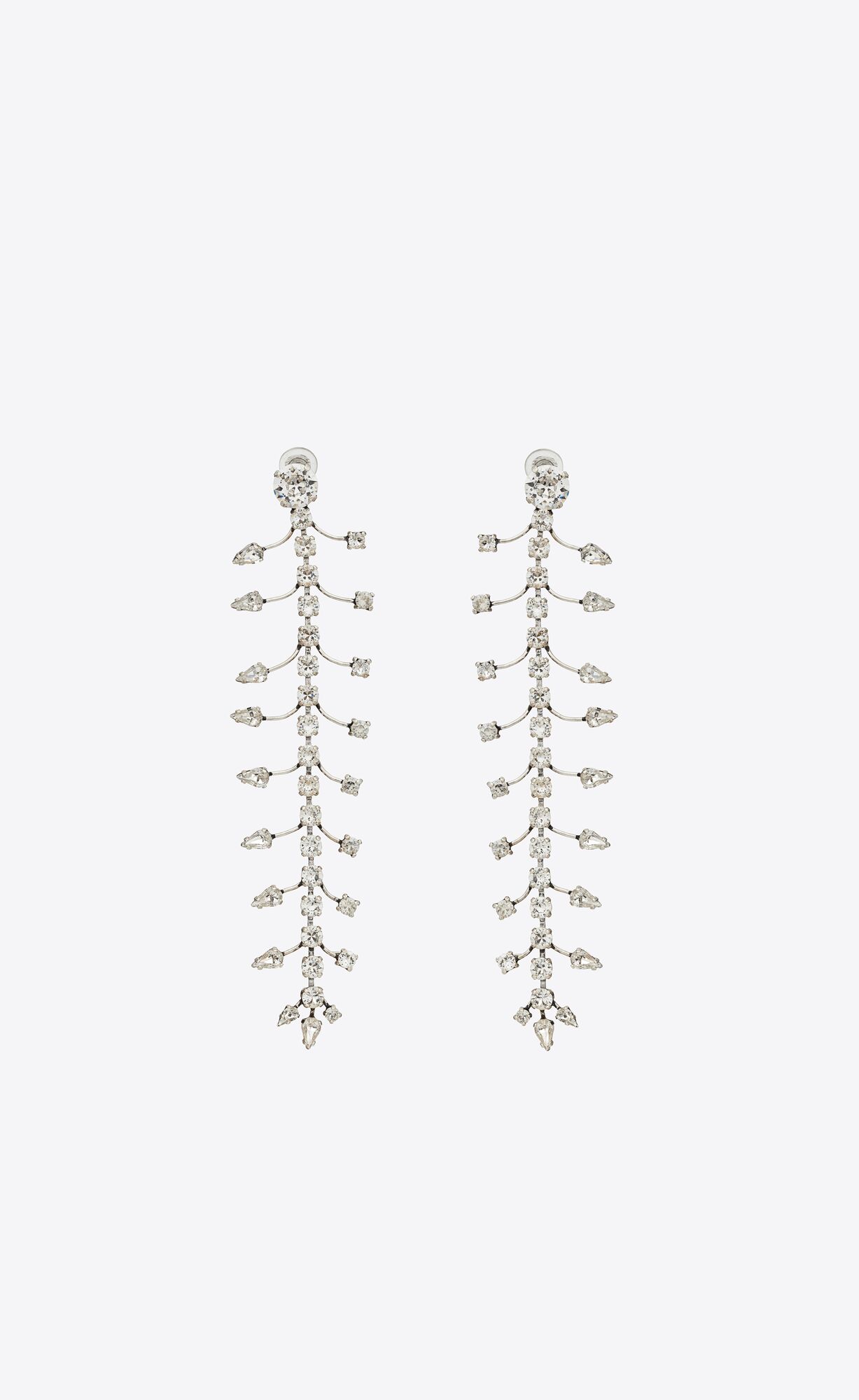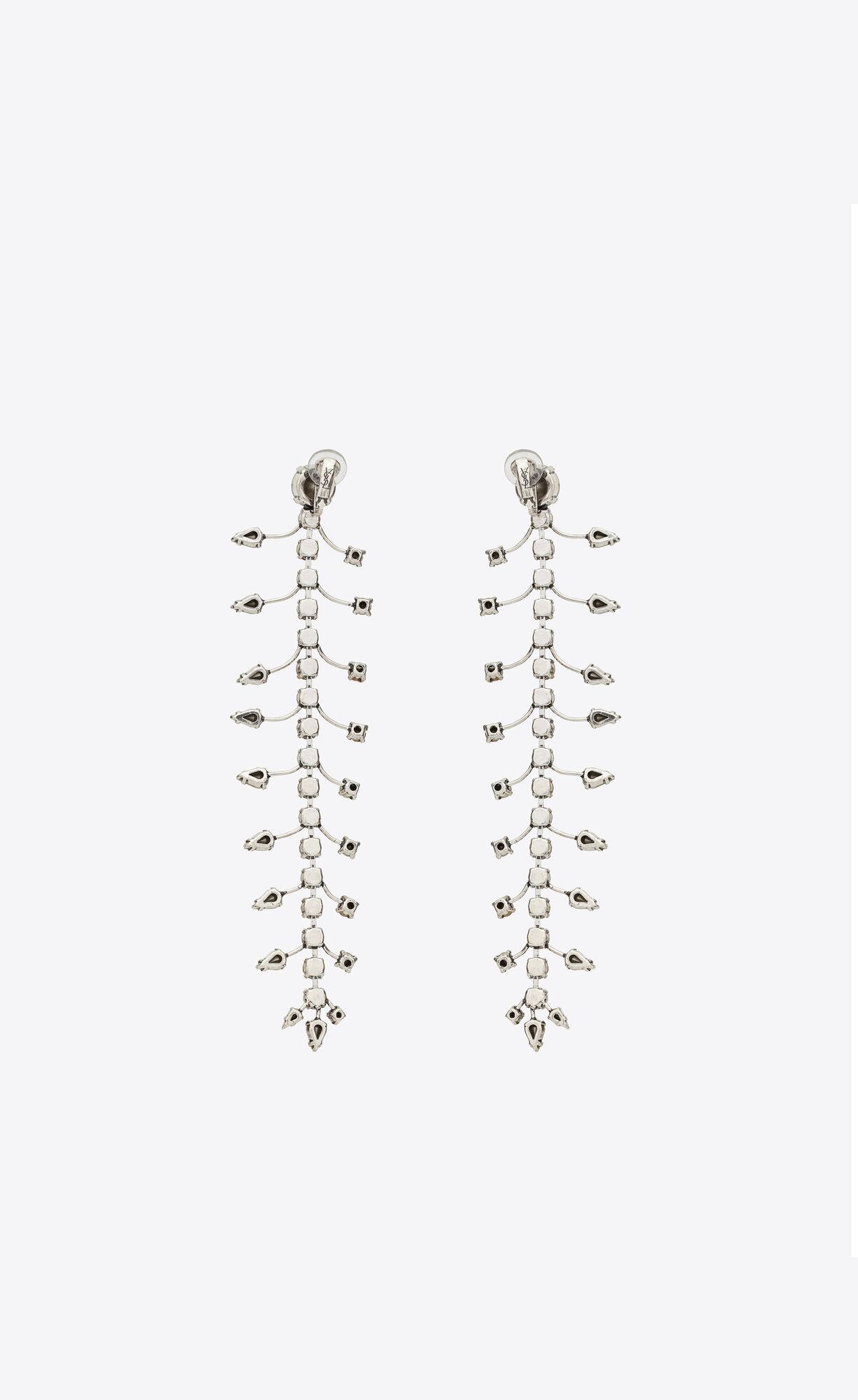 Long clip-on drop earrings featuring spines adorned with differently shaped rhinestones.