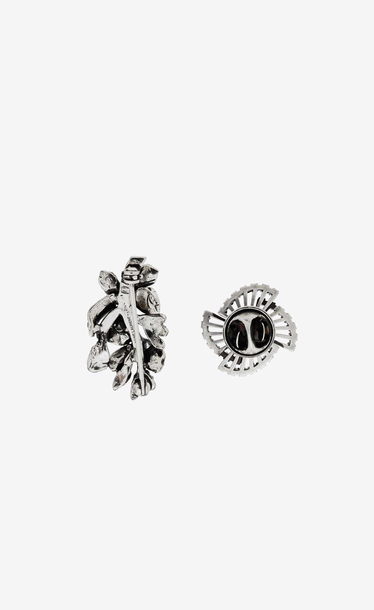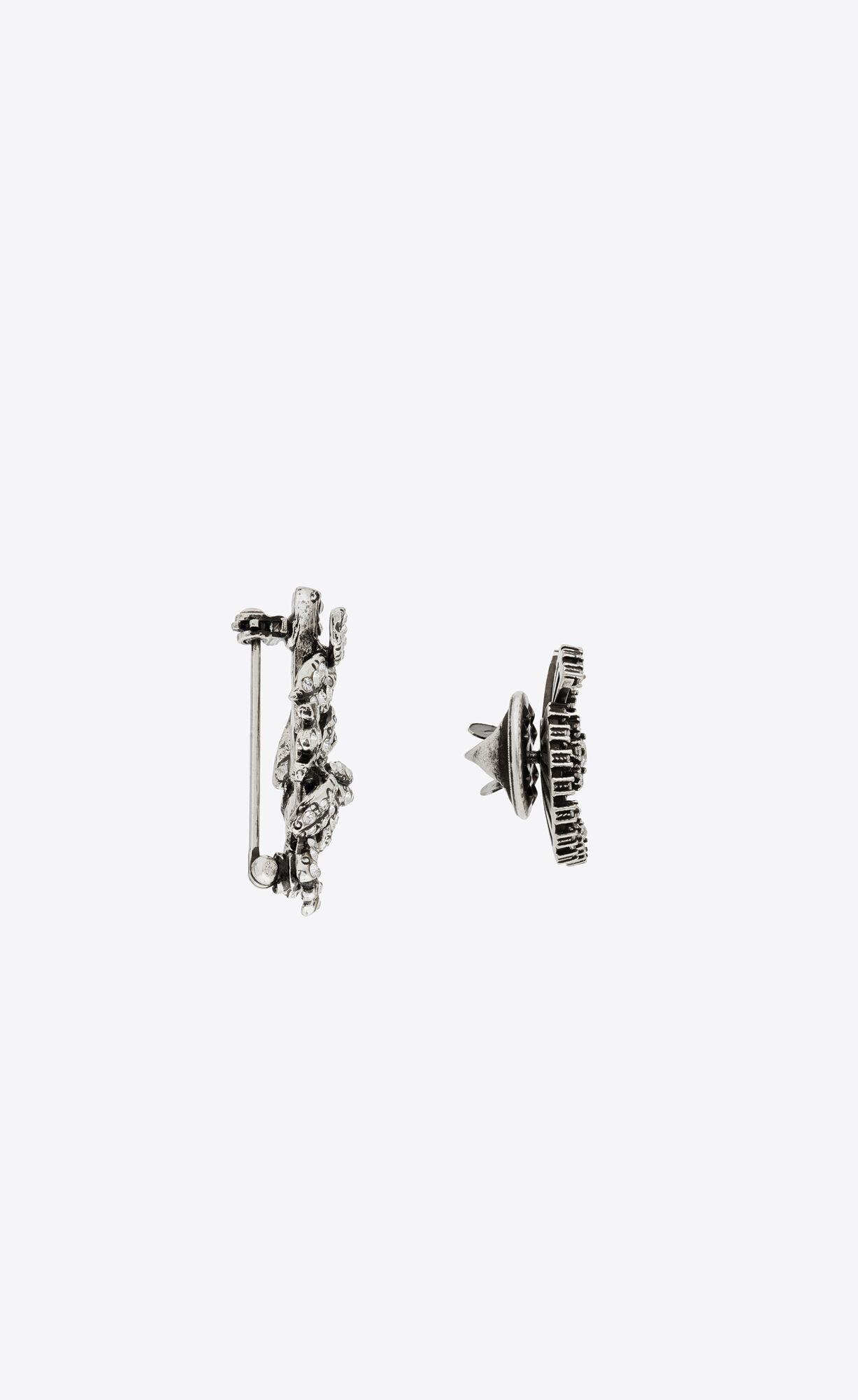 Set of one mini-brooch with branch and leaf motif and one pin with leaf and spiral motif, both adorned with rhinestones.