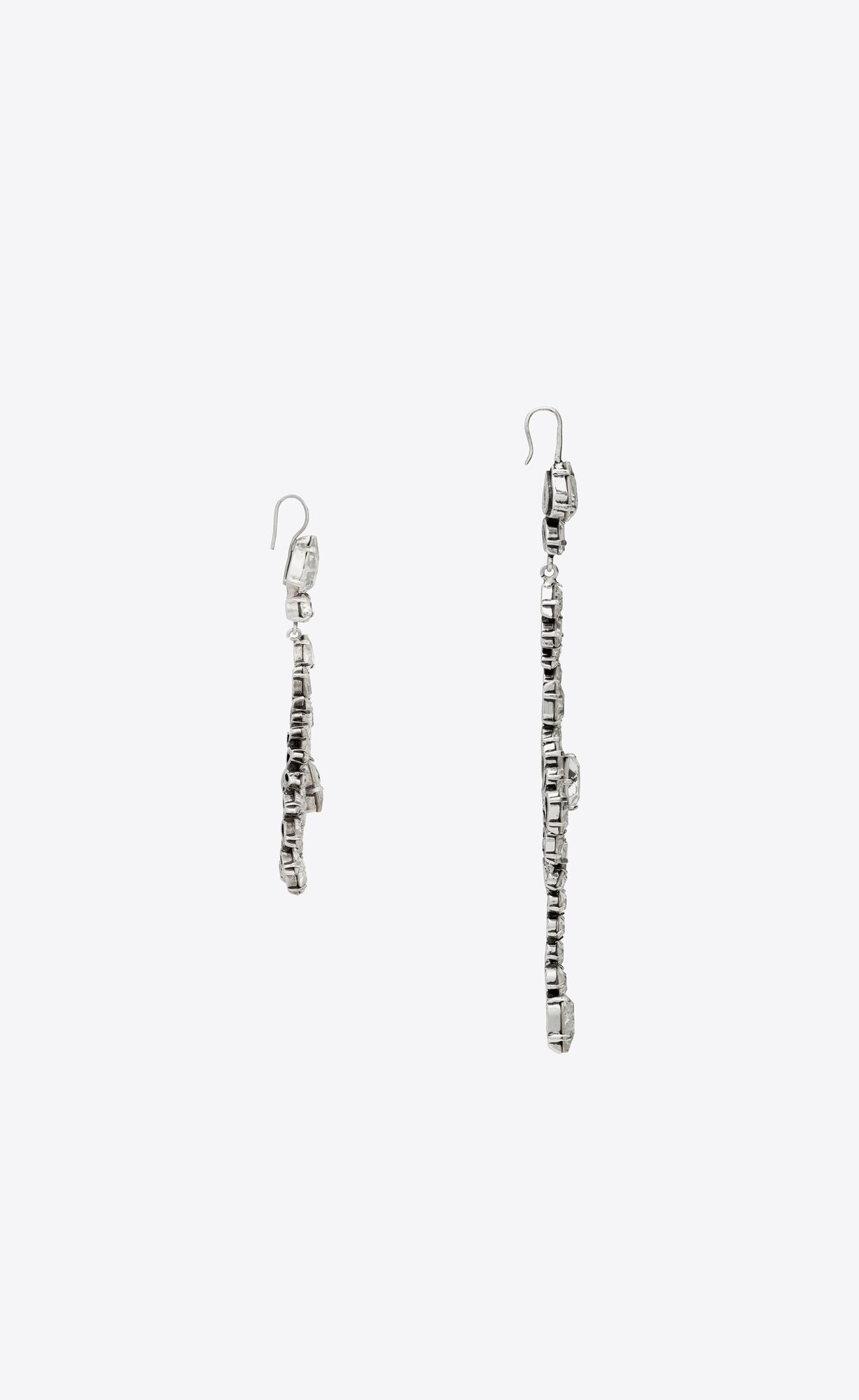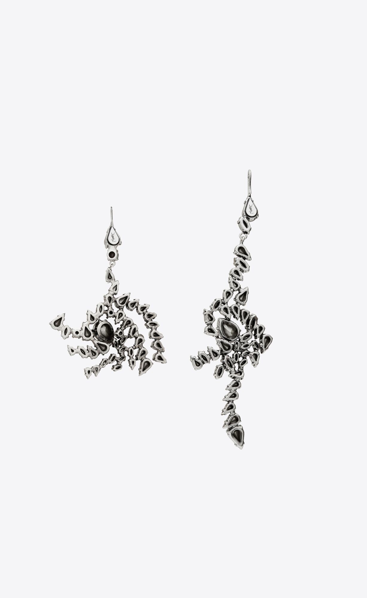 Oversized drop earrings featuring asymmetrical spirals encrusted with pear-shaped rhinestones.