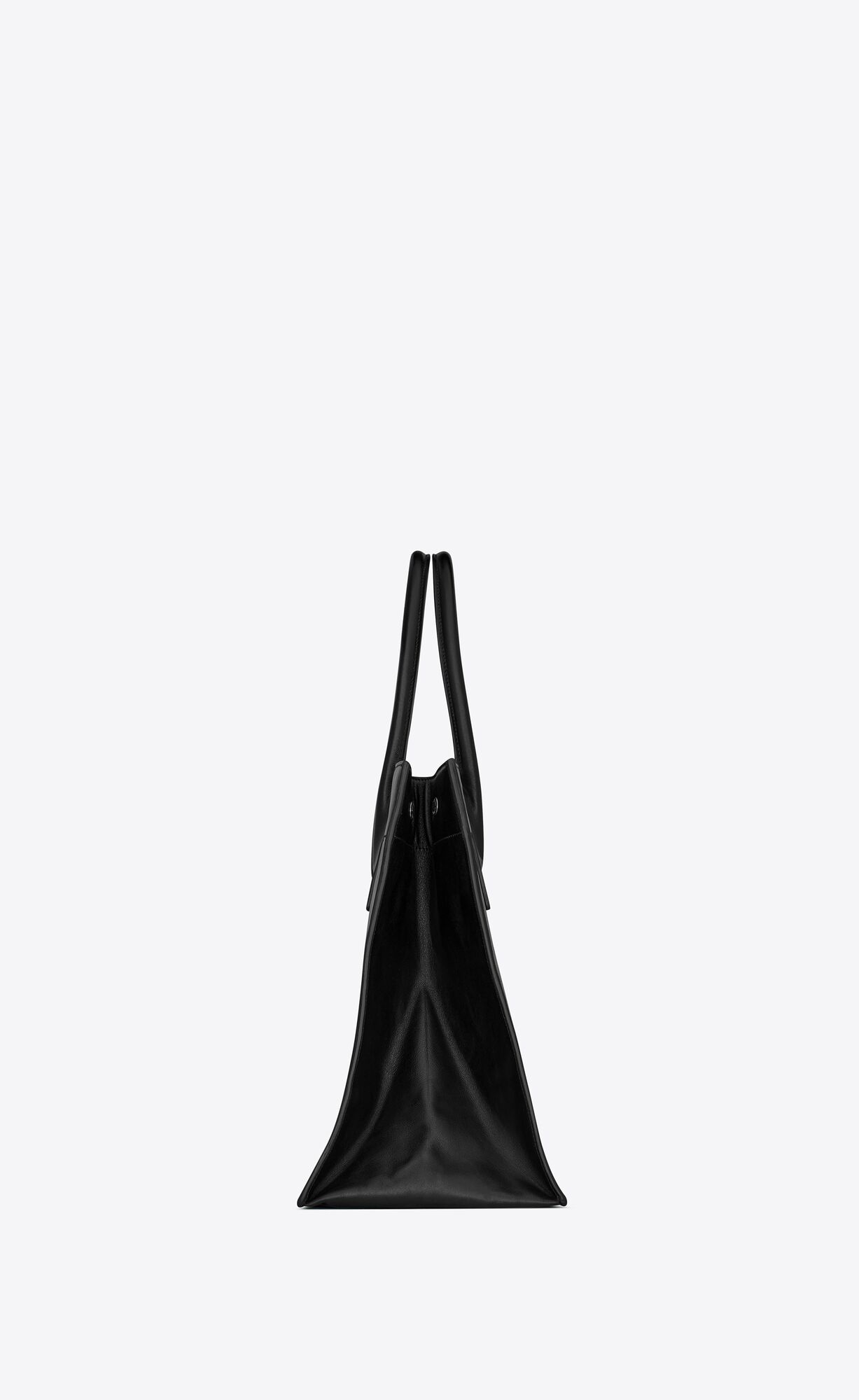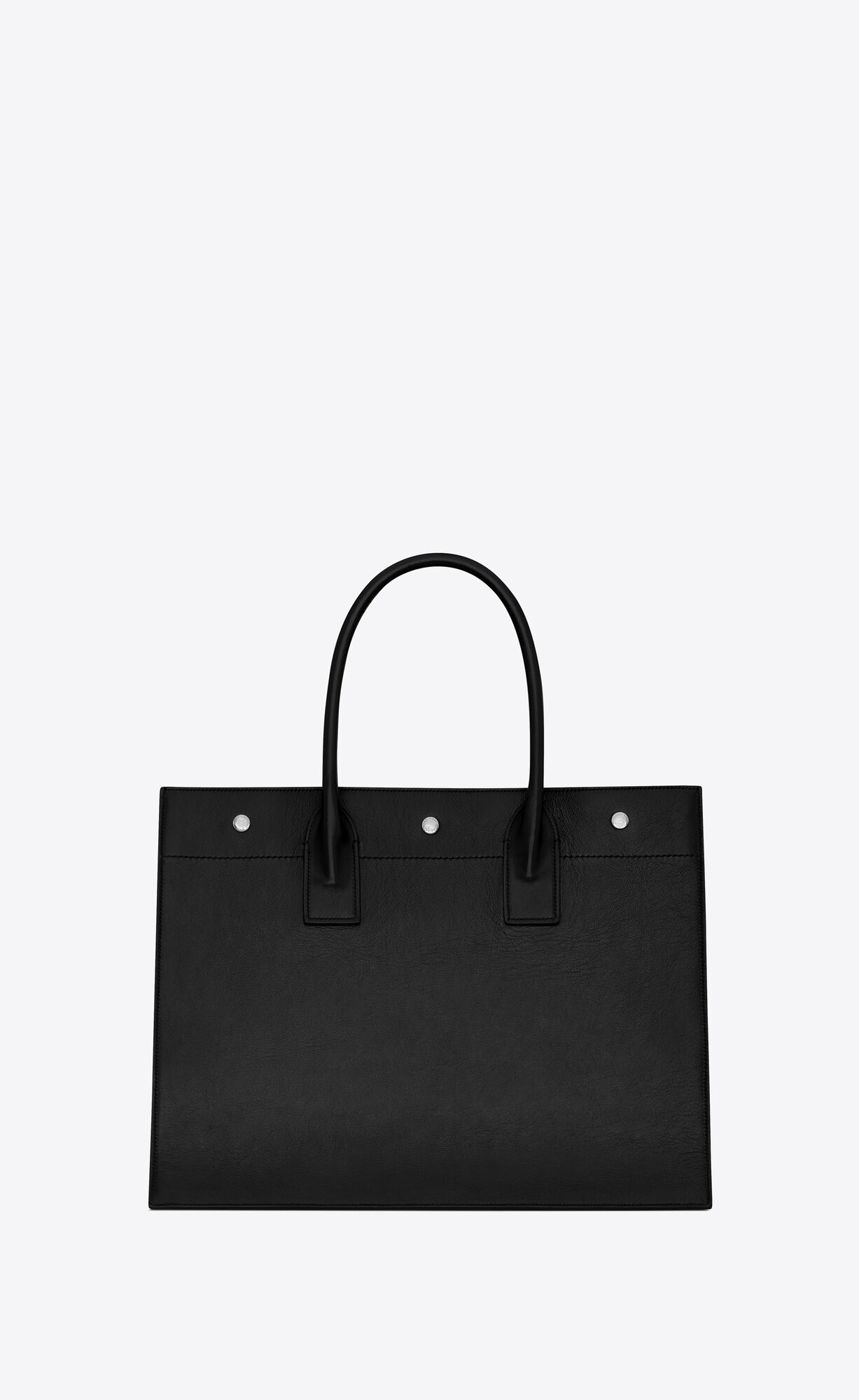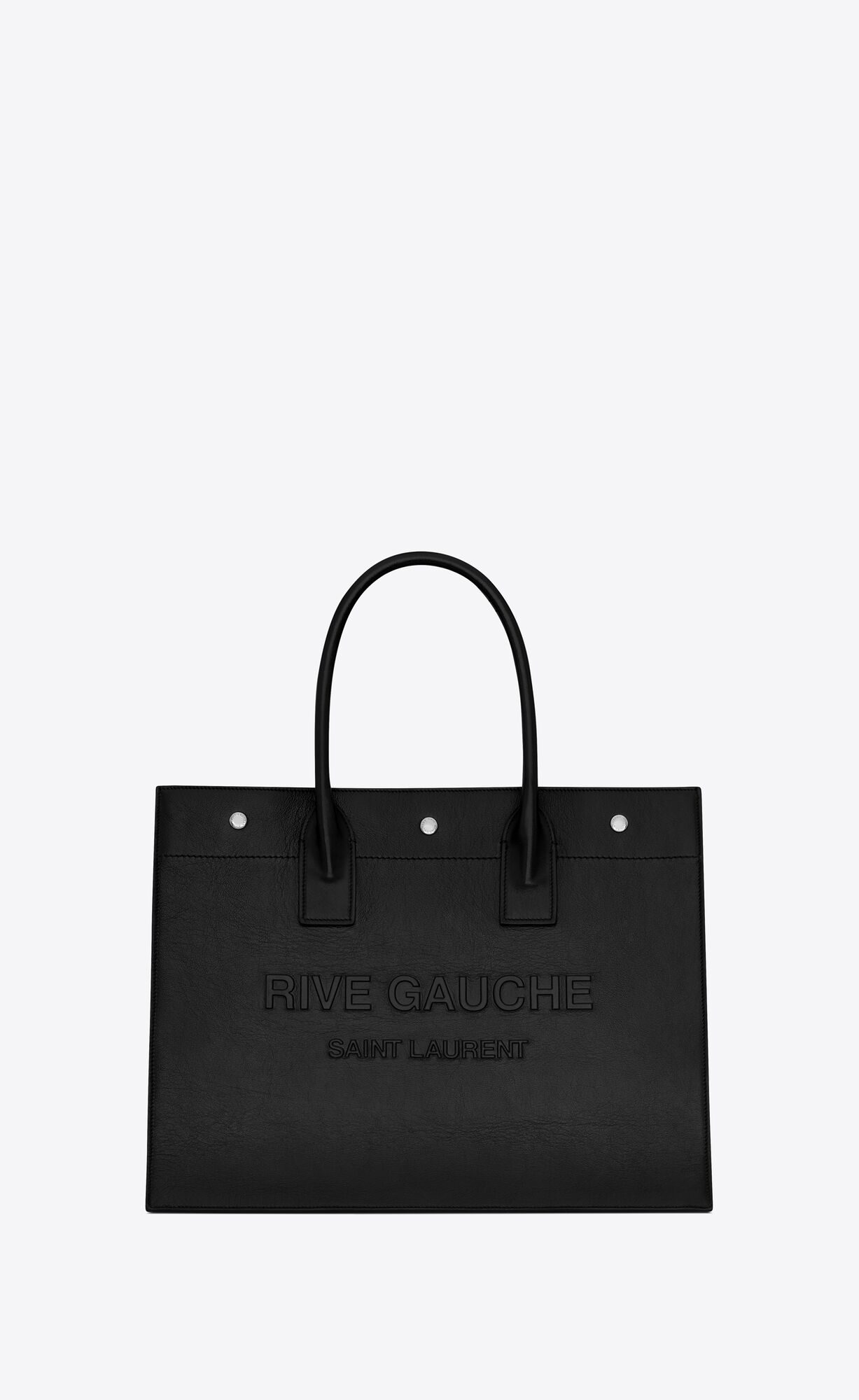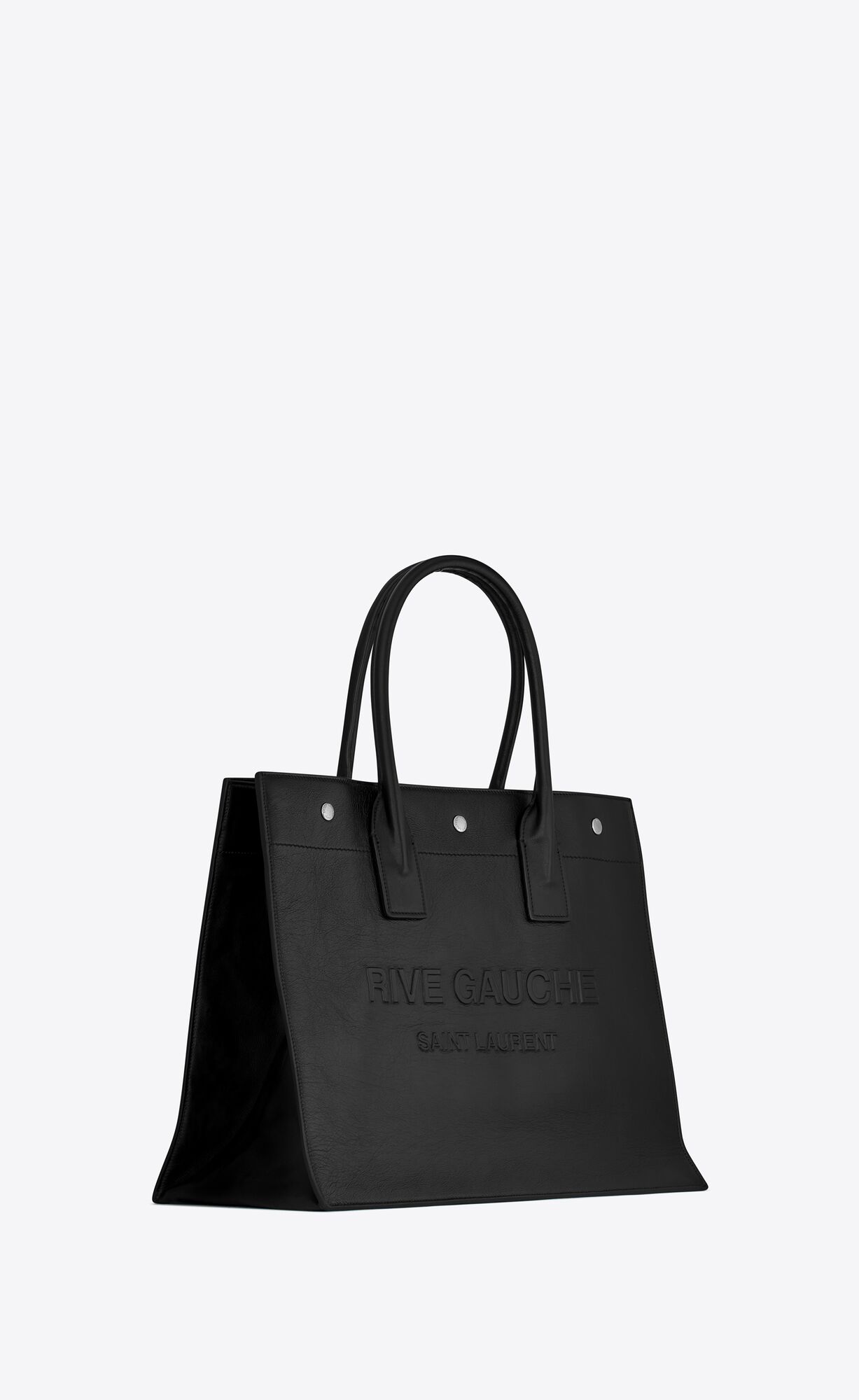 Saint Laurent Rive Gauche small tote bag with tubular handles, fastened with three Saint Laurent-engraved snap buttons and featuring an inside zip pocket.