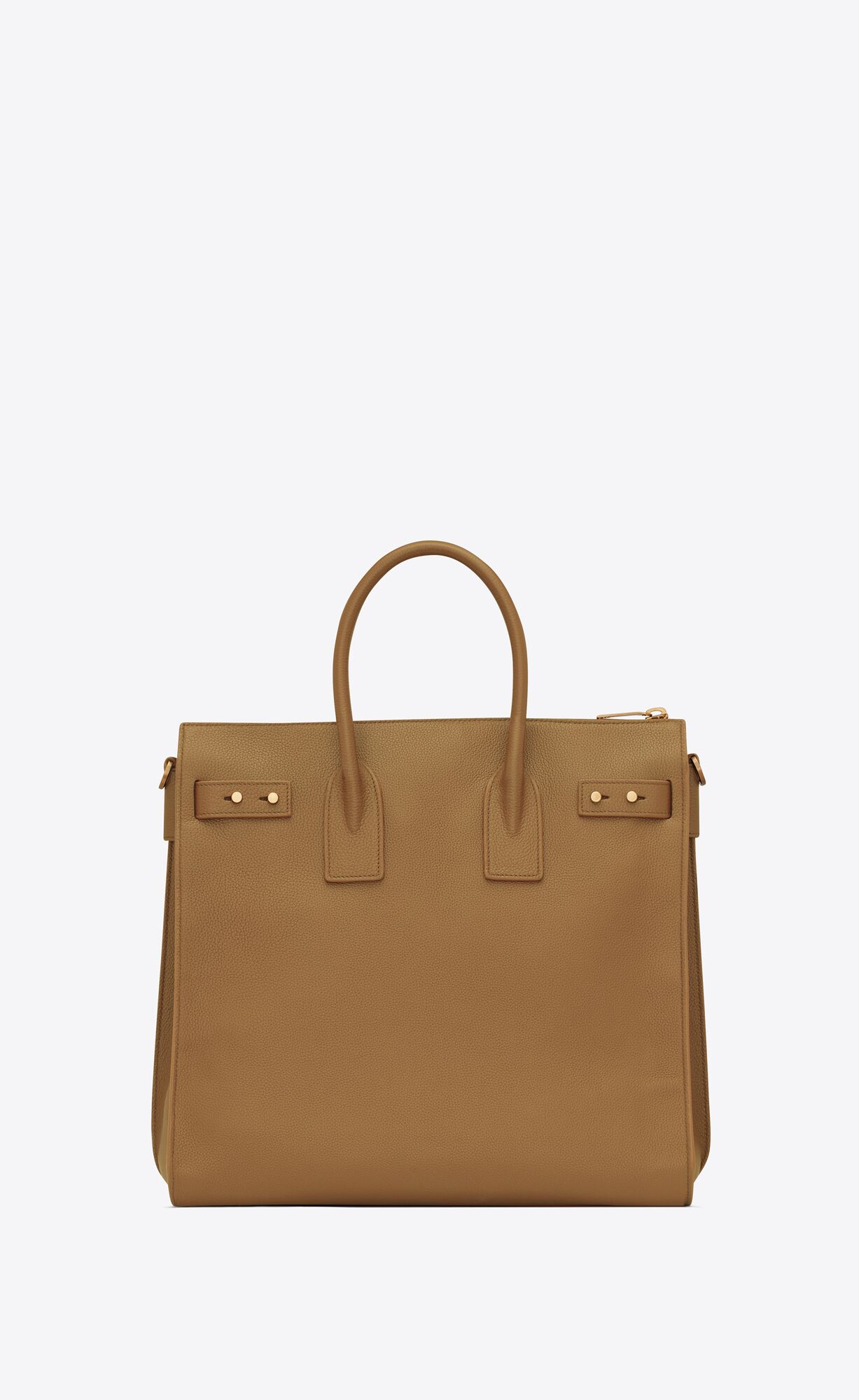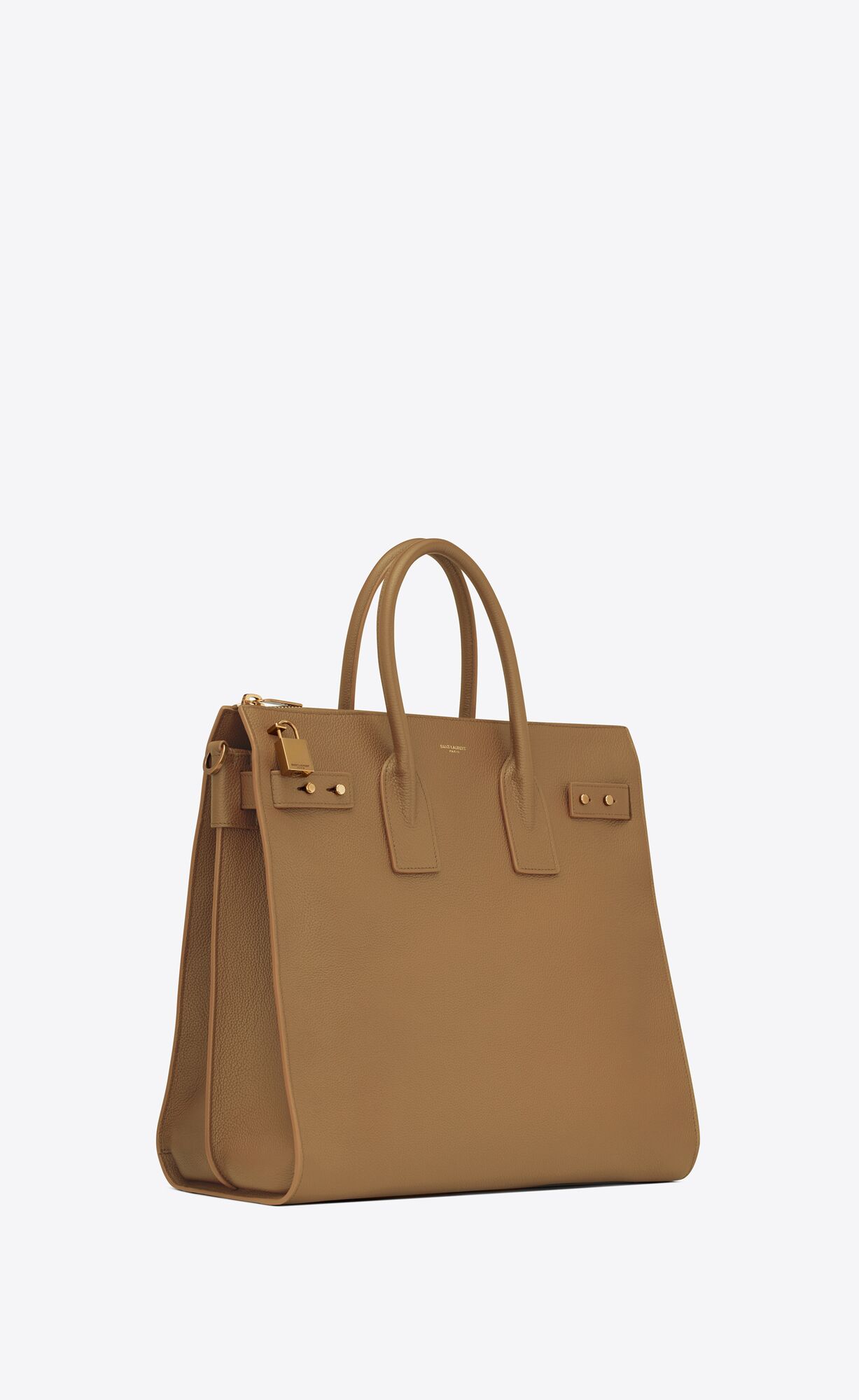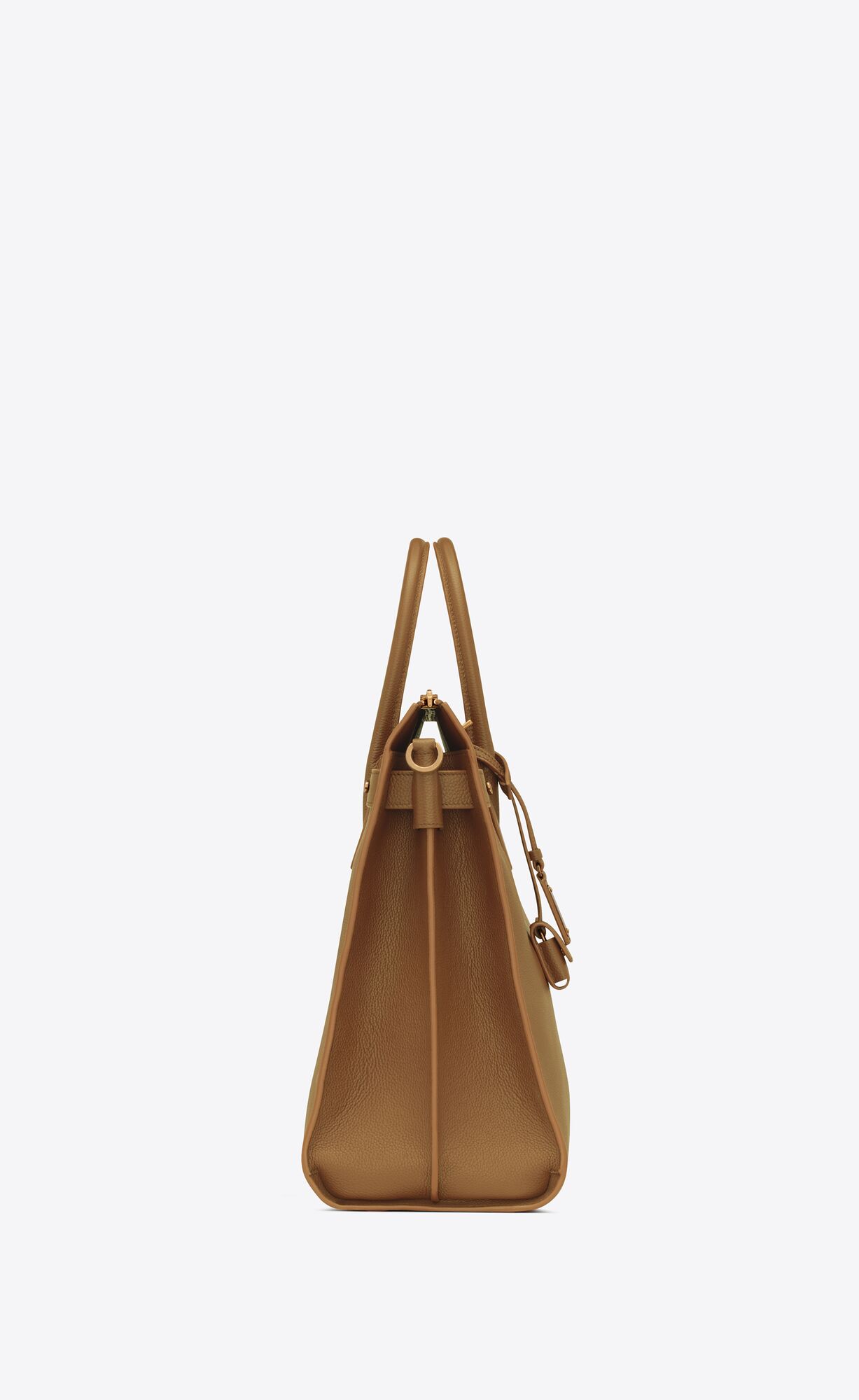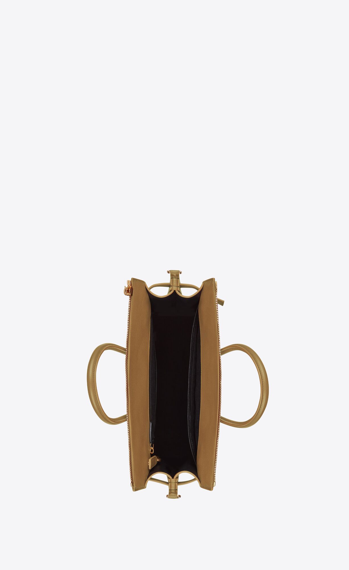 tote bag with soft construction, tubular handles, gusseted sides, compression straps with tabs, embossed saint laurent Paris signature and removable, adjustable leather shoulder strap.