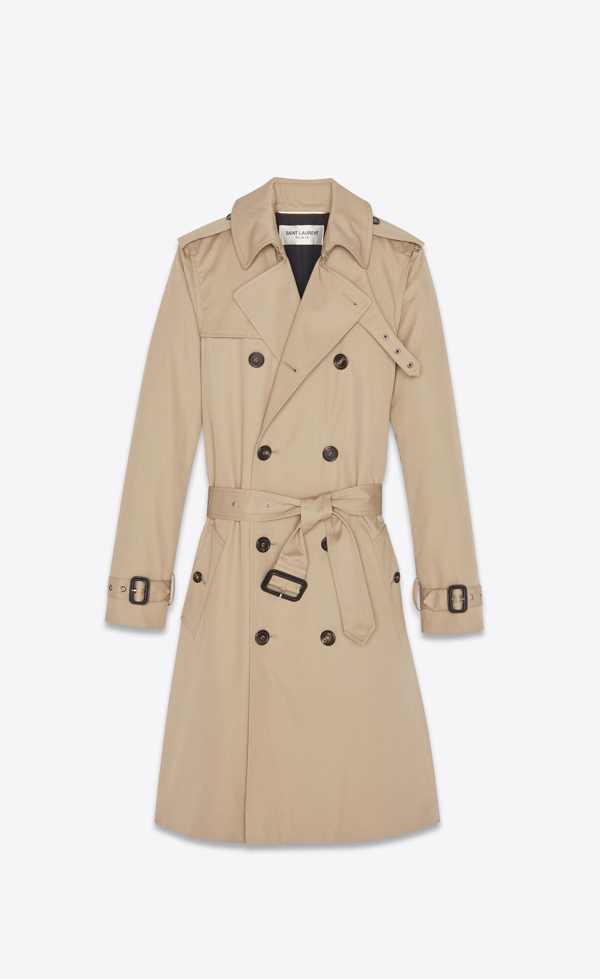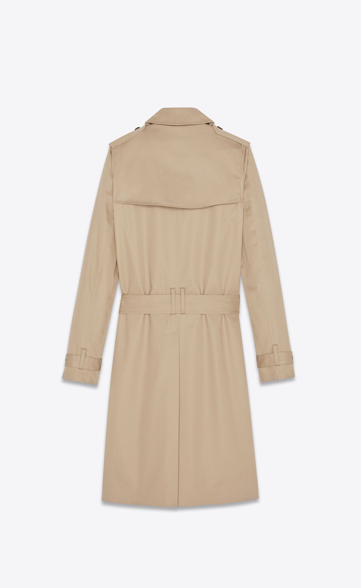 double breasted trench coat made with recycled polyester and organic cotton, featuring long sleeves, a storm patch on the back, belted waist and straps on wrists.