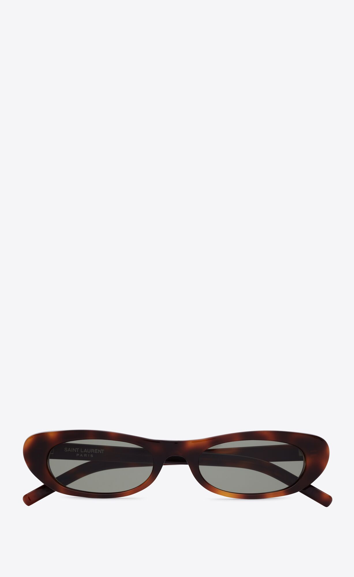 Tortoiseshell sunglasses with narrow elongated cat-eye frames in acetate with nylon lenses.