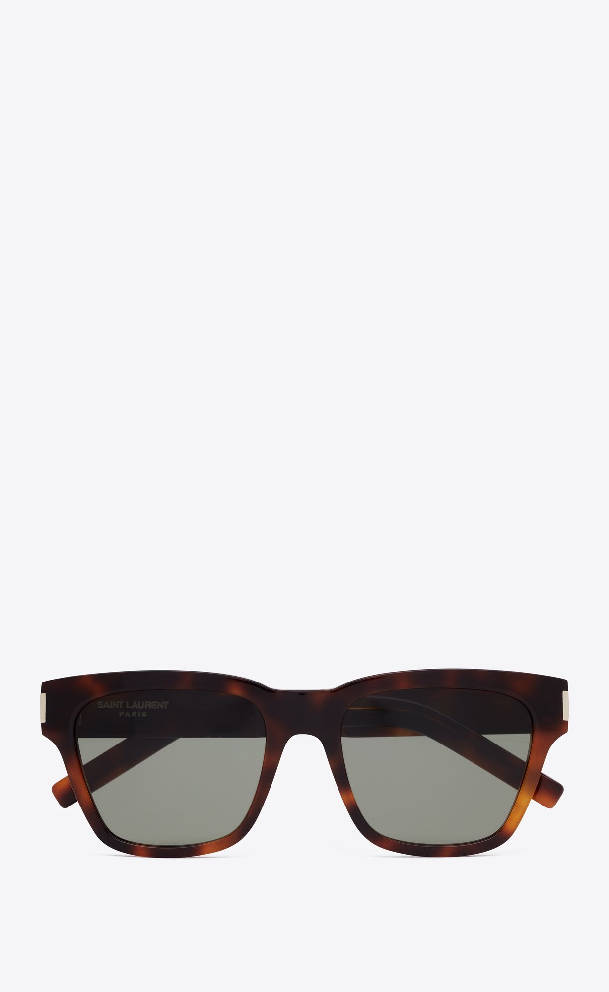 Tortoiseshell sunglasses with thick square acetate frames and nylon lenses, featuring Saint Laurent engraving at the temples.