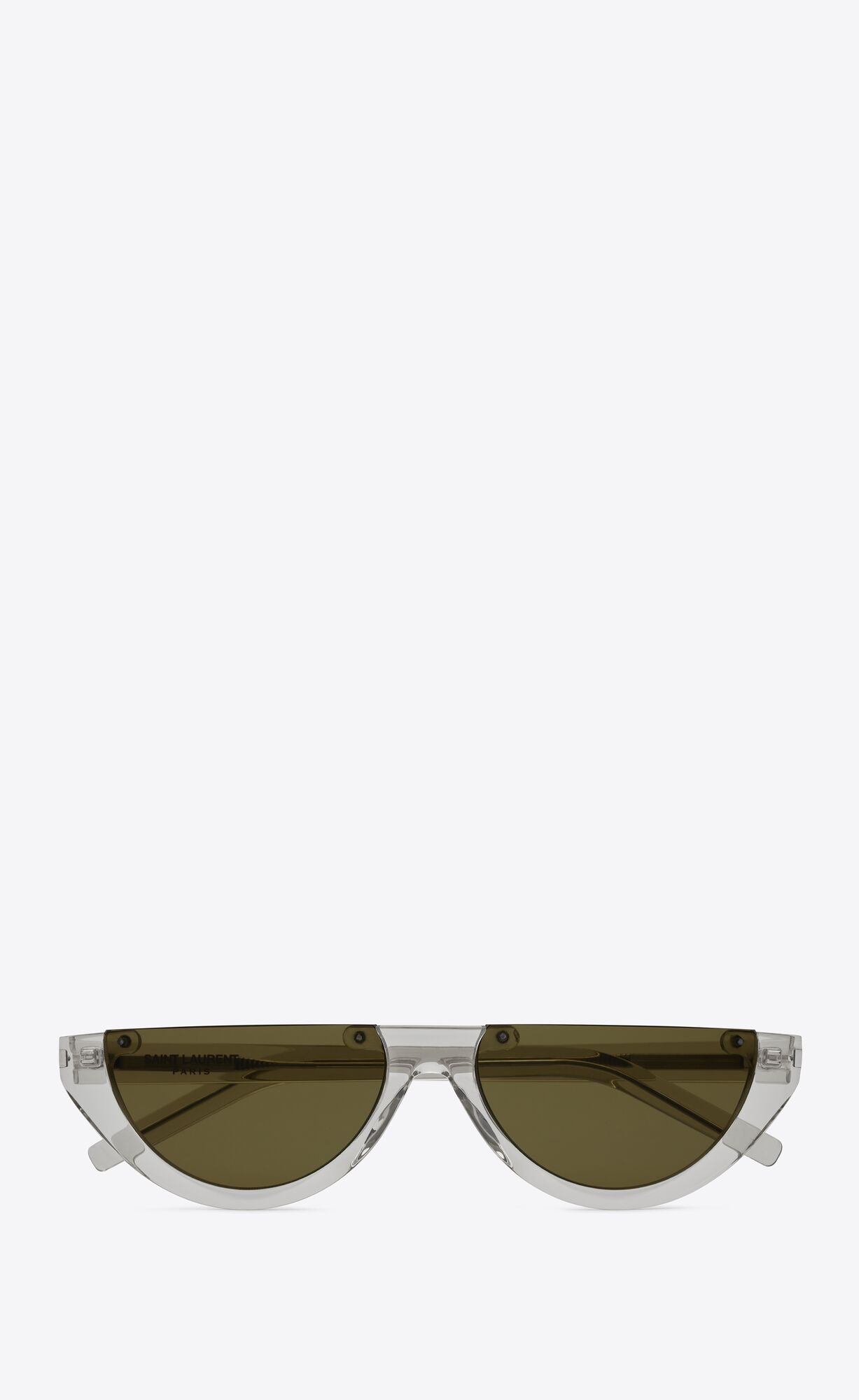 Sunglasses with half-rim elongated cat-eye acetate frames and nylon lenses.