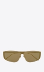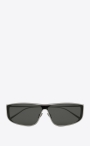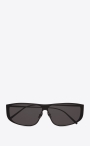 Sunglasses with elongated acetate frames and nylon lenses, featuring contrasting borders.