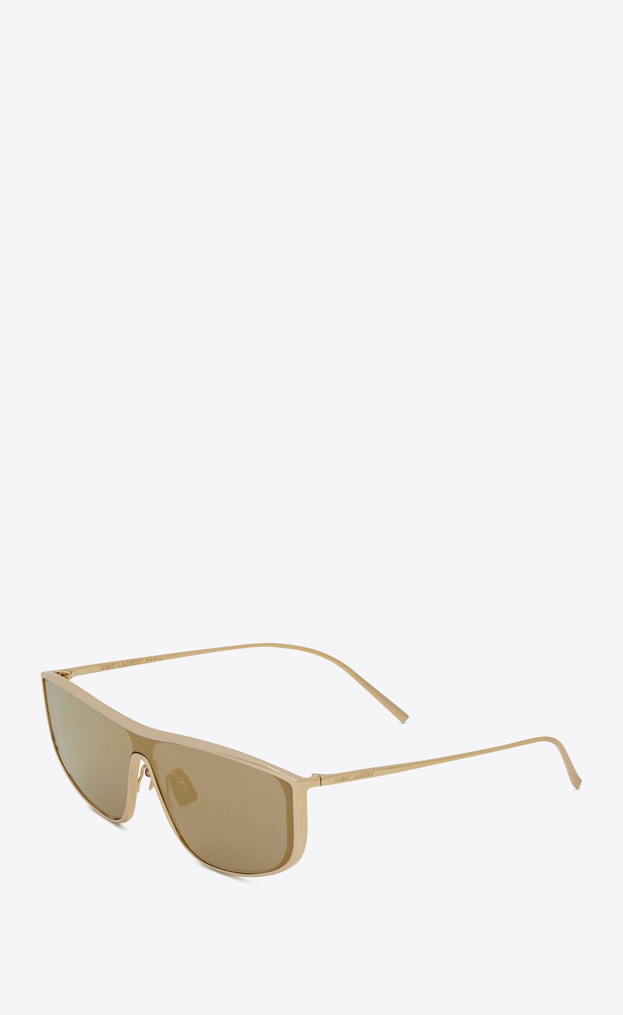 Sunglasses with elongated acetate frames and nylon lenses, featuring contrasting borders.
