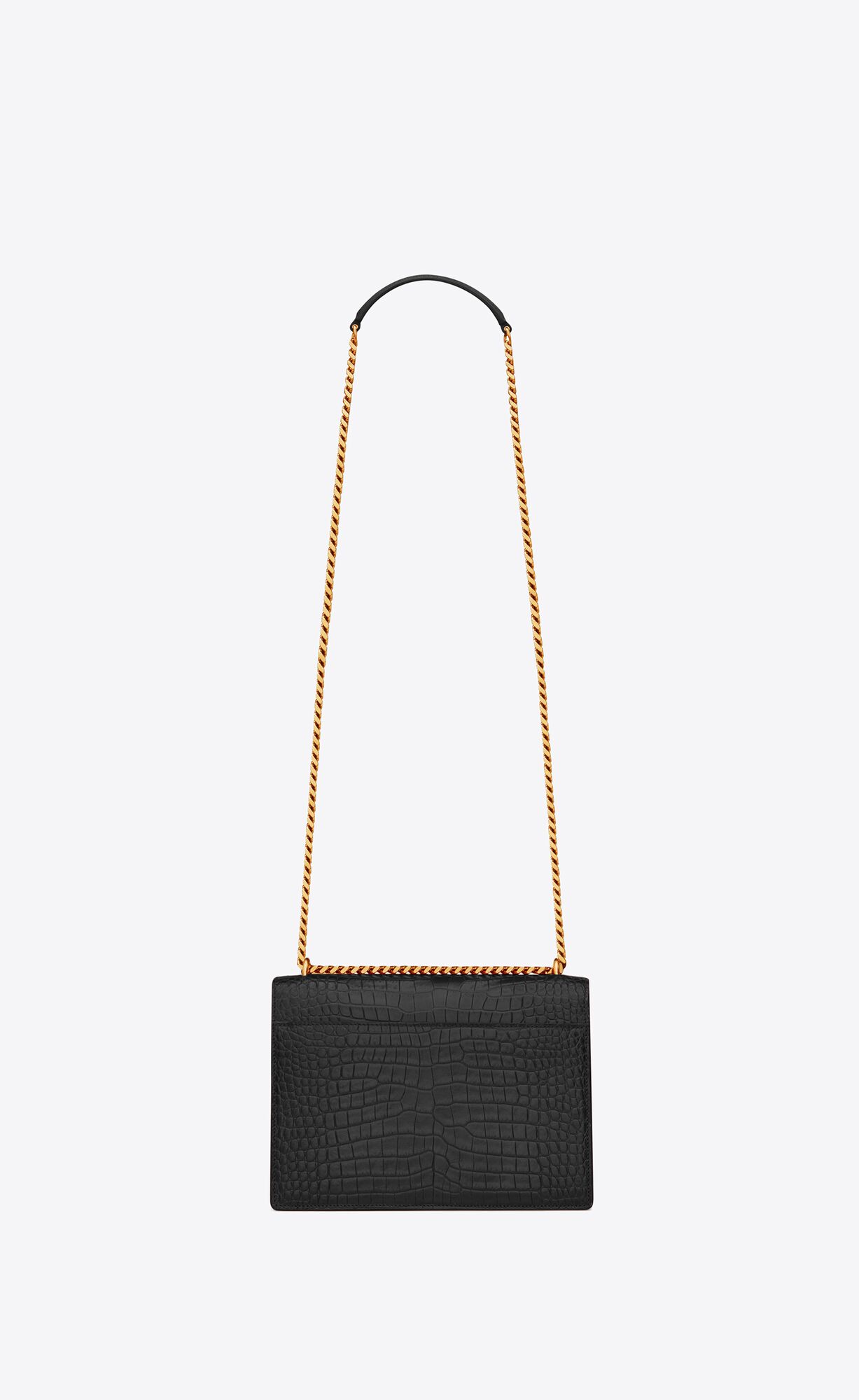 bag WITH FRONT FLAP, FEATURING SIDE GUSSETS, CHAIN AND LEATHER SHOULDER STRAP THAT CAN BE WORN CROSSBODY OR SHORTENED ON THE SHOULDER, A LEATHER-ENCASED KEY RING AND THE CASSANDRE IN METAL.