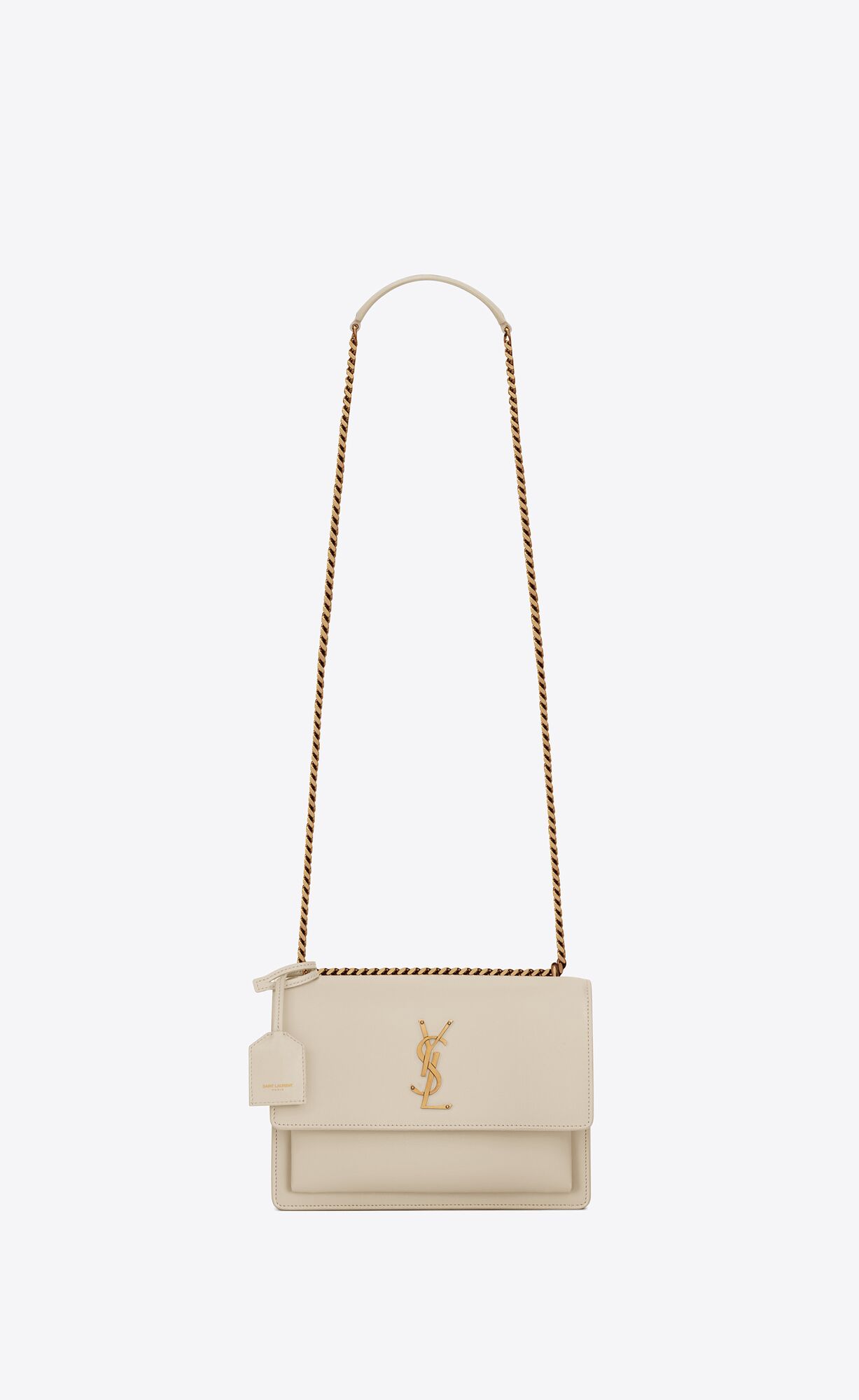bag with front flap, featuring side gussets, chain and leather shoulder strap that can be worn across the body or shortened on the shoulder, a leather-encased key ring and THE CASSANDRE in metal.