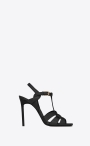 High heel stiletto sandals with intertwining straps made with metal-free tanned leather, featuring a squared toe and adjustable ankle strap engraved with Saint Laurent Paris.