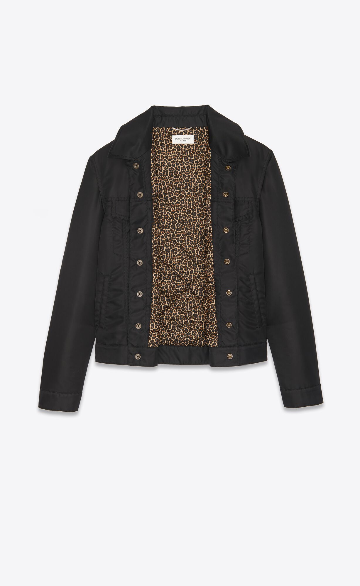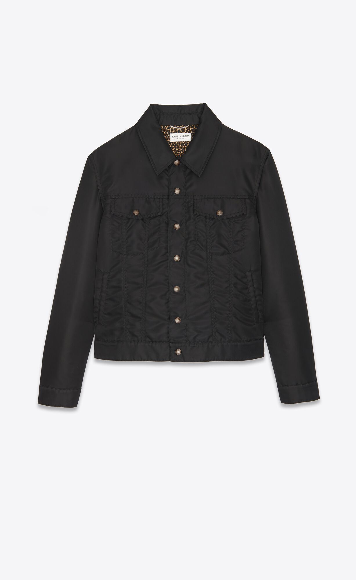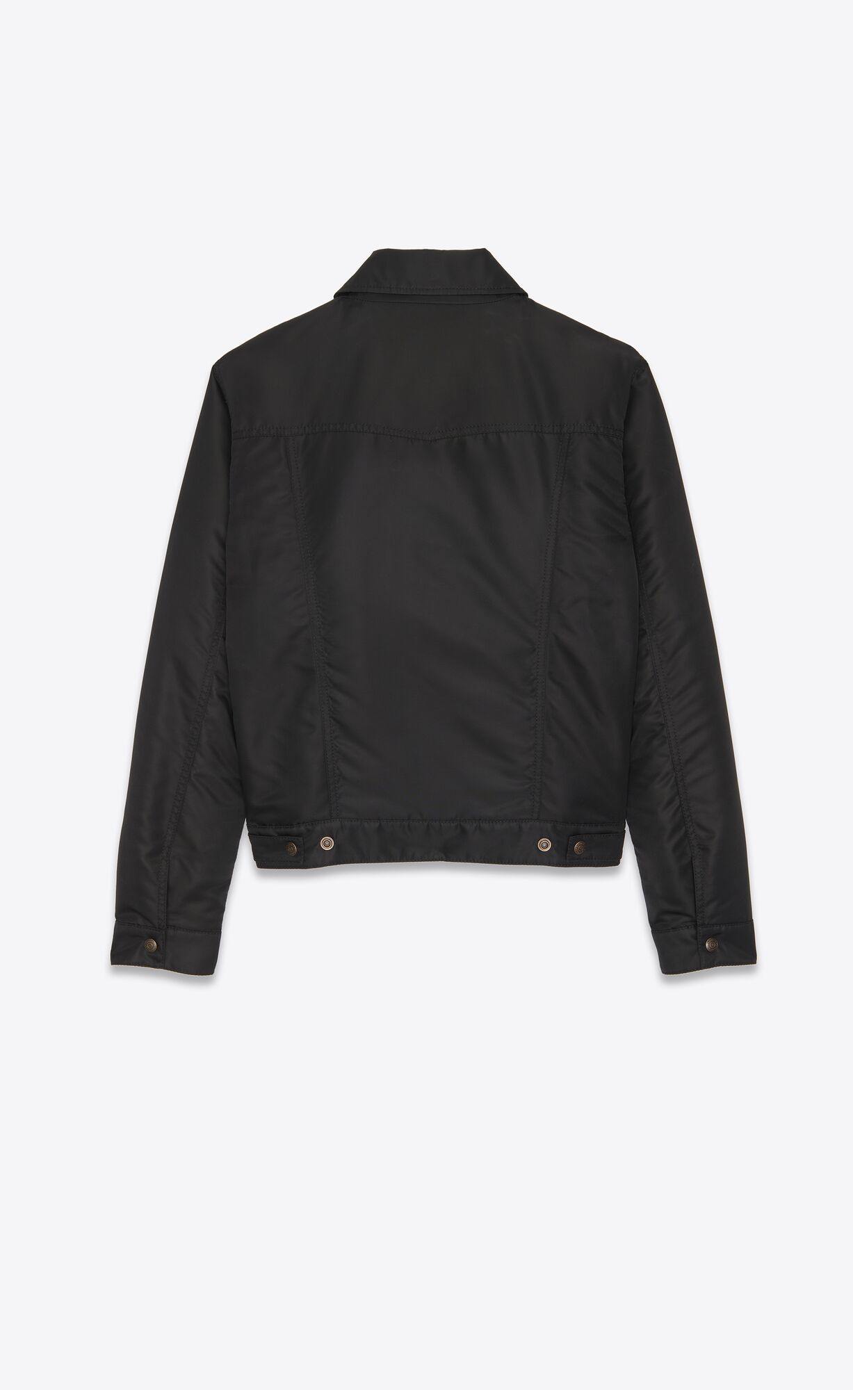 Trucker jacket made with recycled polyamide with pointed collar, front snap button closure and buttoned flap pockets on the chest.