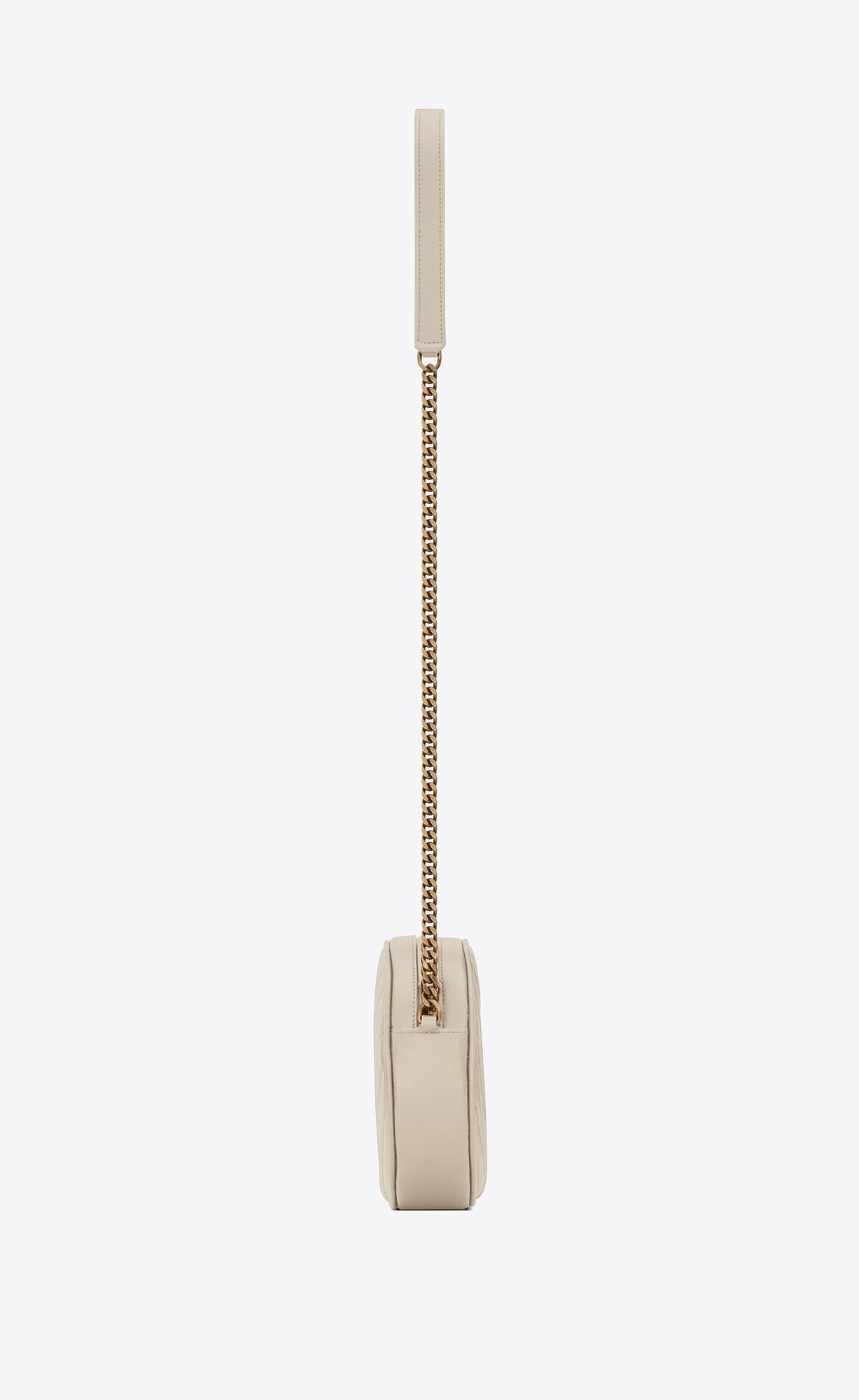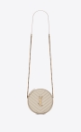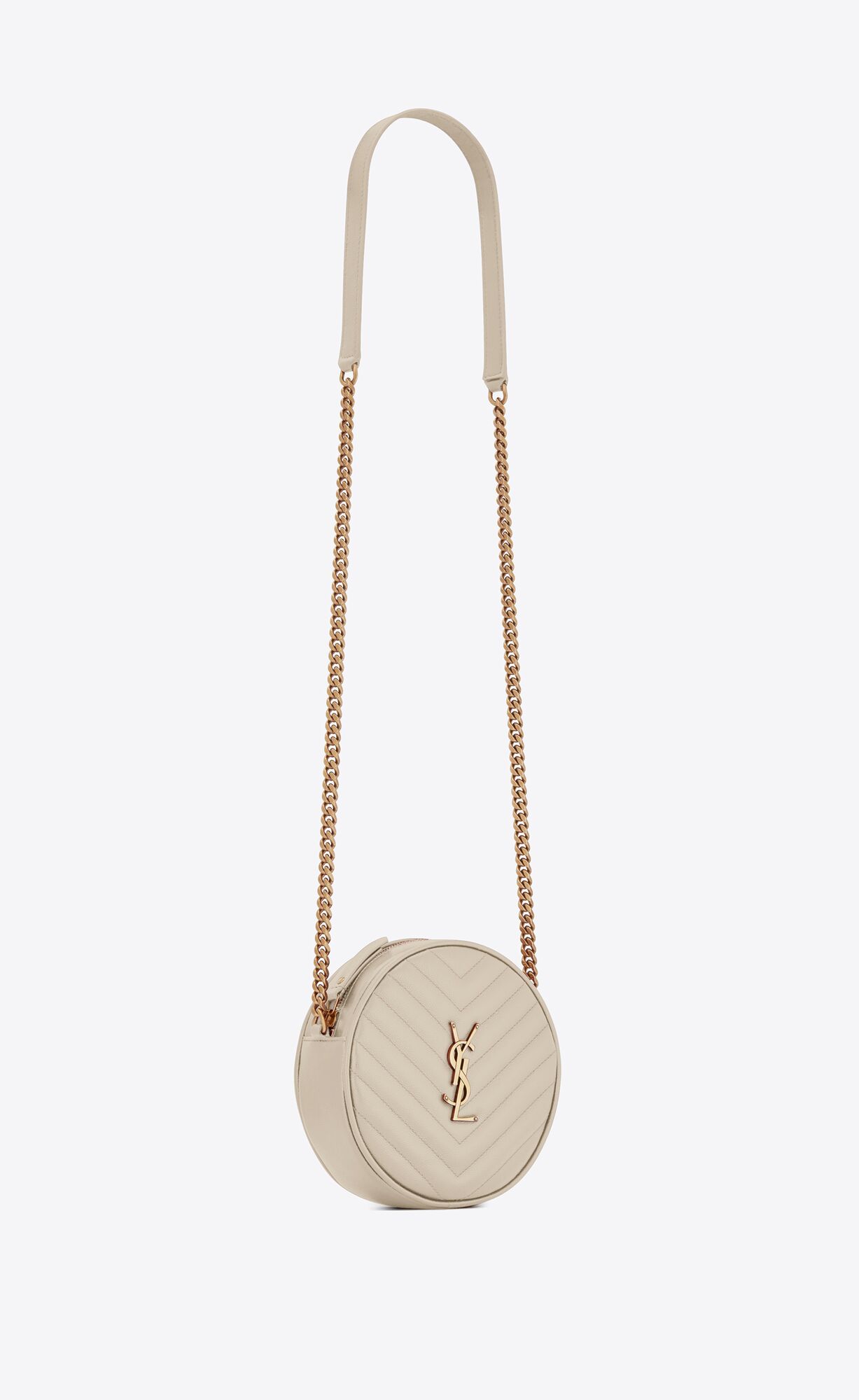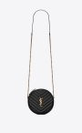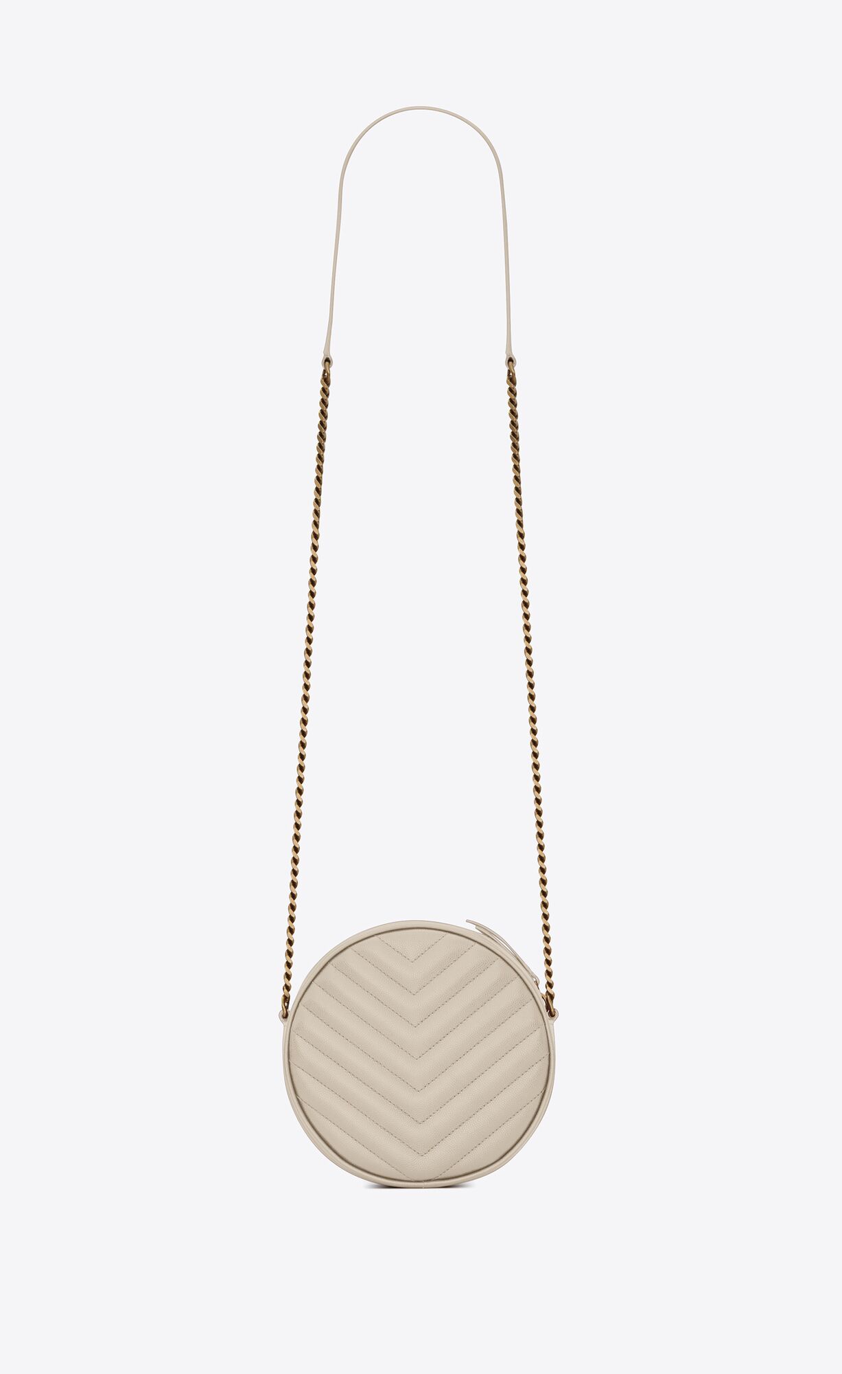 Round crossbody bag decorated with chevron quilted overstitching and THE CASSANDRE, featuring a chain and leather shoulder strap.